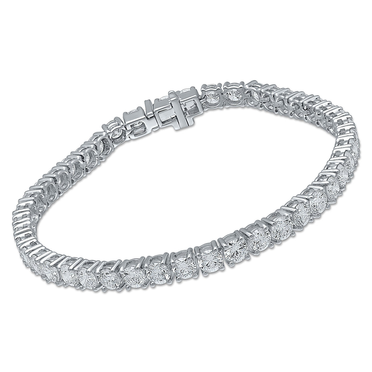 A single row of sparkling brilliant cut diamonds is set in beautiful shared 14kt white gold four prong settings in this sparkling lab diamond tennis bracelet with a total weight of approx 10 carats. The sturdy lock hugs your wrist gently while dazzling diamonds flow and sparkle flexibly with every move.
