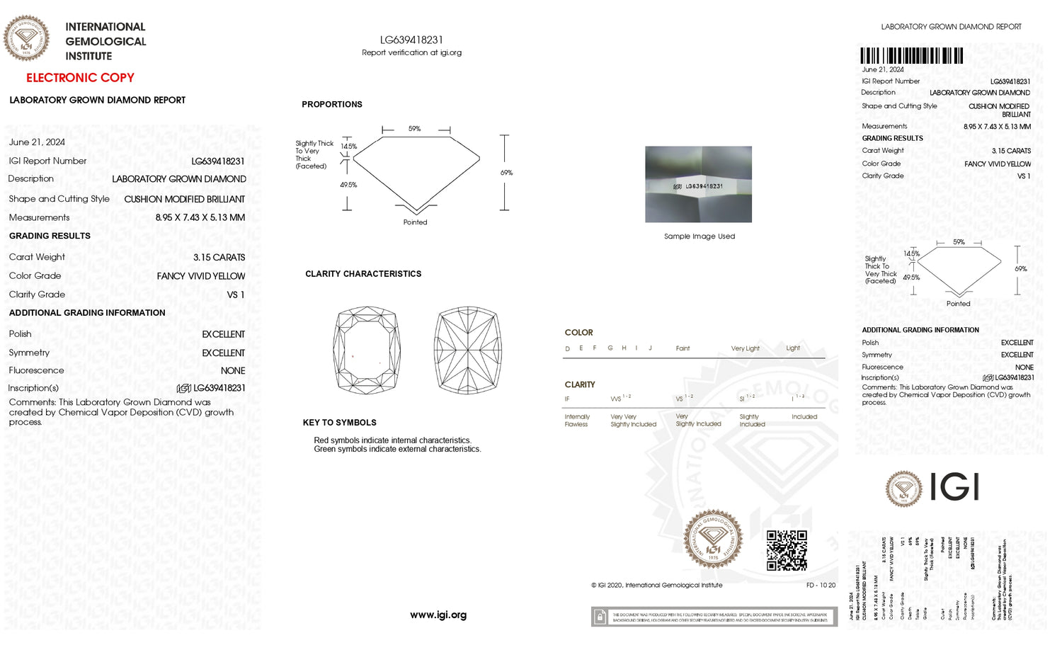 The diamond showcases excellent polish and symmetry, enhancing light performance and overall visual appeal. Its proportions—59% table and 69% depth—strike a refined balance between brightness and fire. Grown using the CVD process and designated as Type IIa, it possesses exceptional purity and quality.