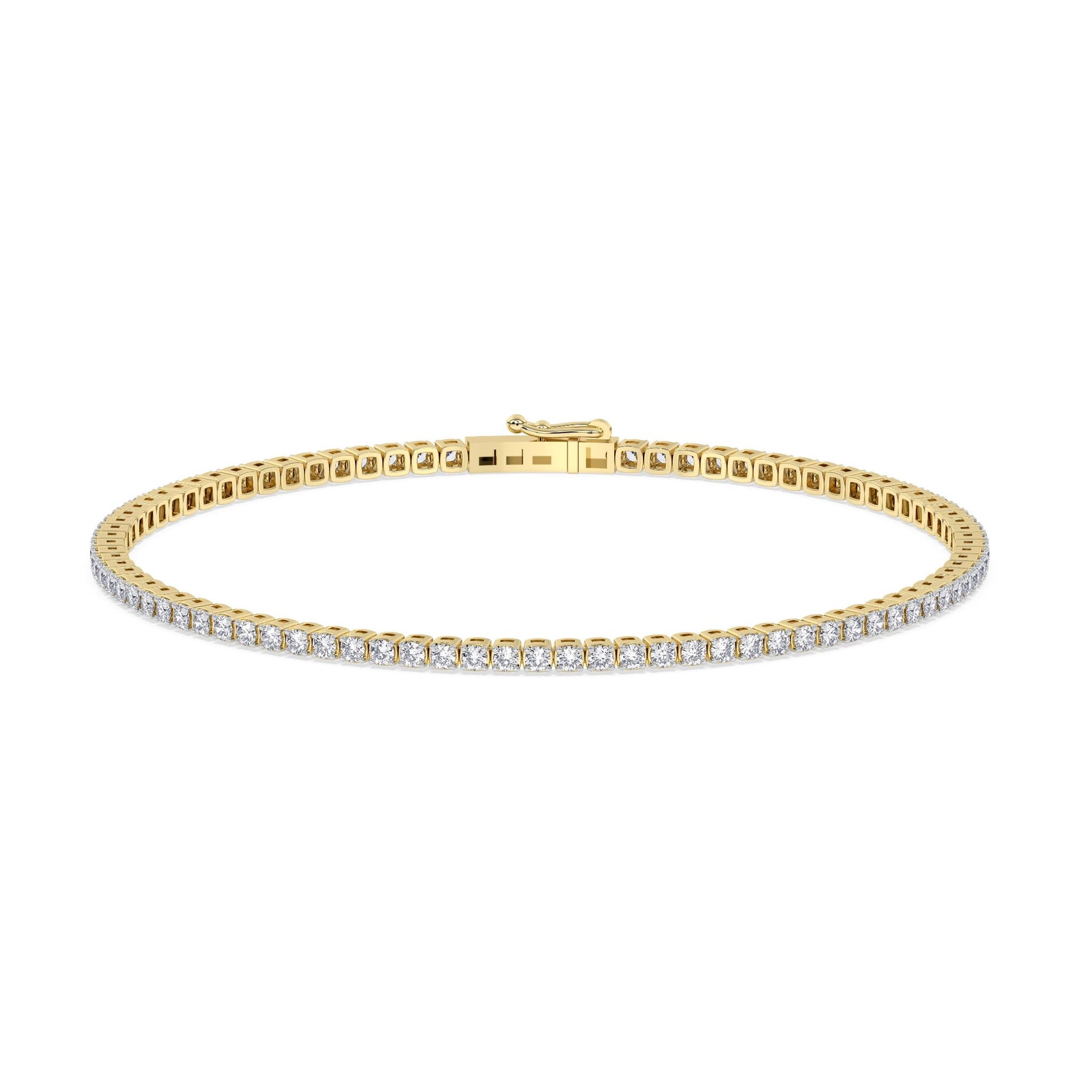 This 14kt yellow gold tennis bracelet with a total weight of approx 2 carats features a single row of sparkling brilliant cut diamonds set in a shared four prong setting. A set of firm, sturdy locks hugs your wrist gently while the dazzling diamonds sparkle beautifully.