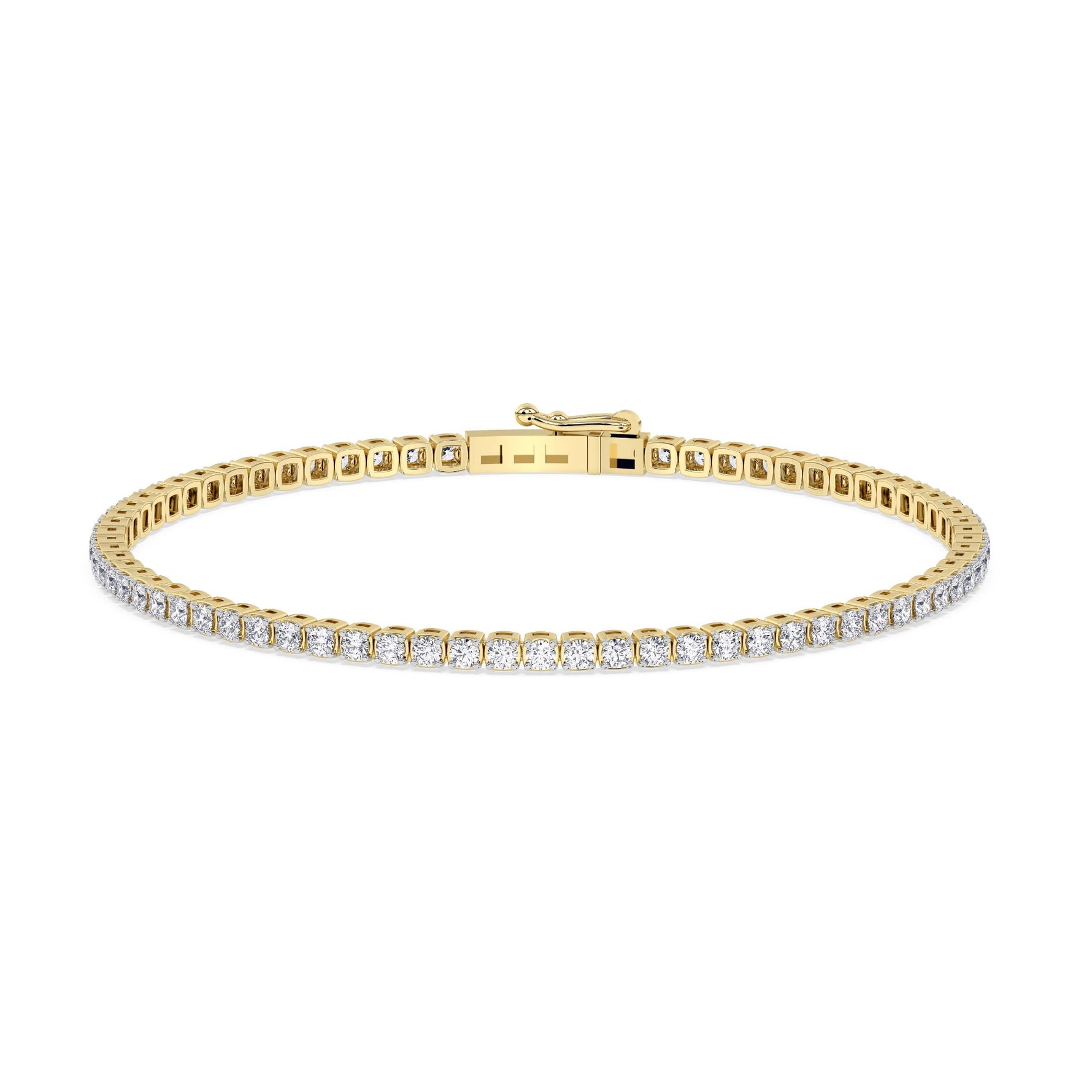 This 14kt yellow gold tennis bracelet with a total weight of approx 3 carats features a single row of sparkling brilliant cut diamonds set in a shared four prong setting. A set of firm, sturdy locks hugs your wrist gently while the dazzling diamonds sparkle beautifully.