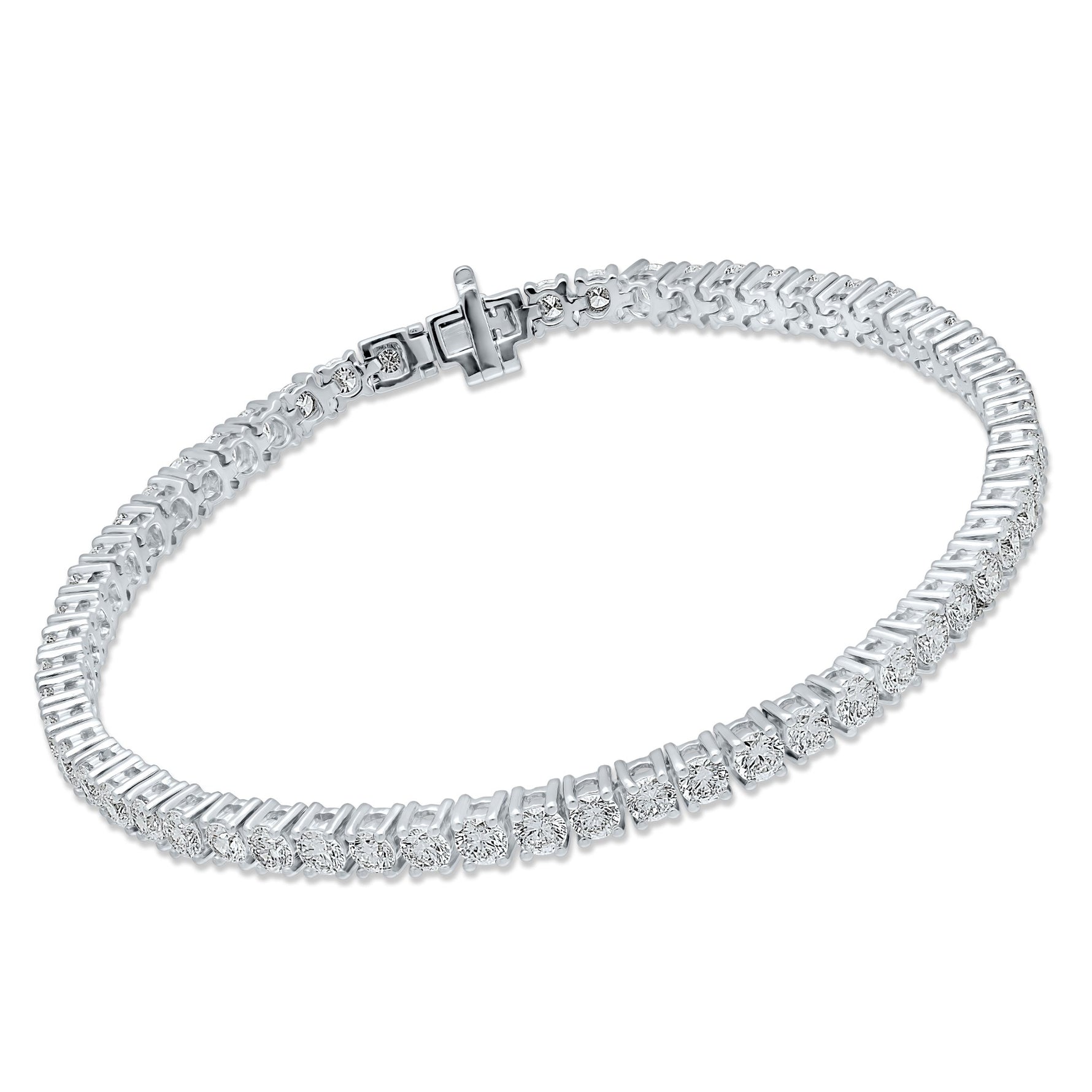 A single row of sparkling brilliant cut diamonds is set in beautiful shared 14kt white gold four prong settings in this sparkling lab diamond tennis bracelet with a total weight of approx 5 carats. The sturdy lock hugs your wrist gently while dazzling diamonds flow and sparkle flexibly with every move.