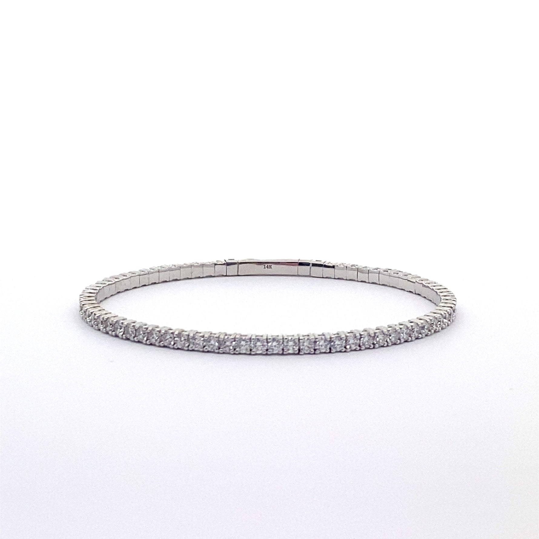 Sleek and radiant, this 14K white gold bangle bracelet features 3.82 carats of round brilliant lab grown diamonds set in a timeless, polished design. Graded F in color and VS1 in clarity, the diamonds deliver exceptional sparkle and clean, modern elegance. Perfect for stacking or wearing solo, this bangle is a refined statement piece made for everyday luxury. BAN-00006