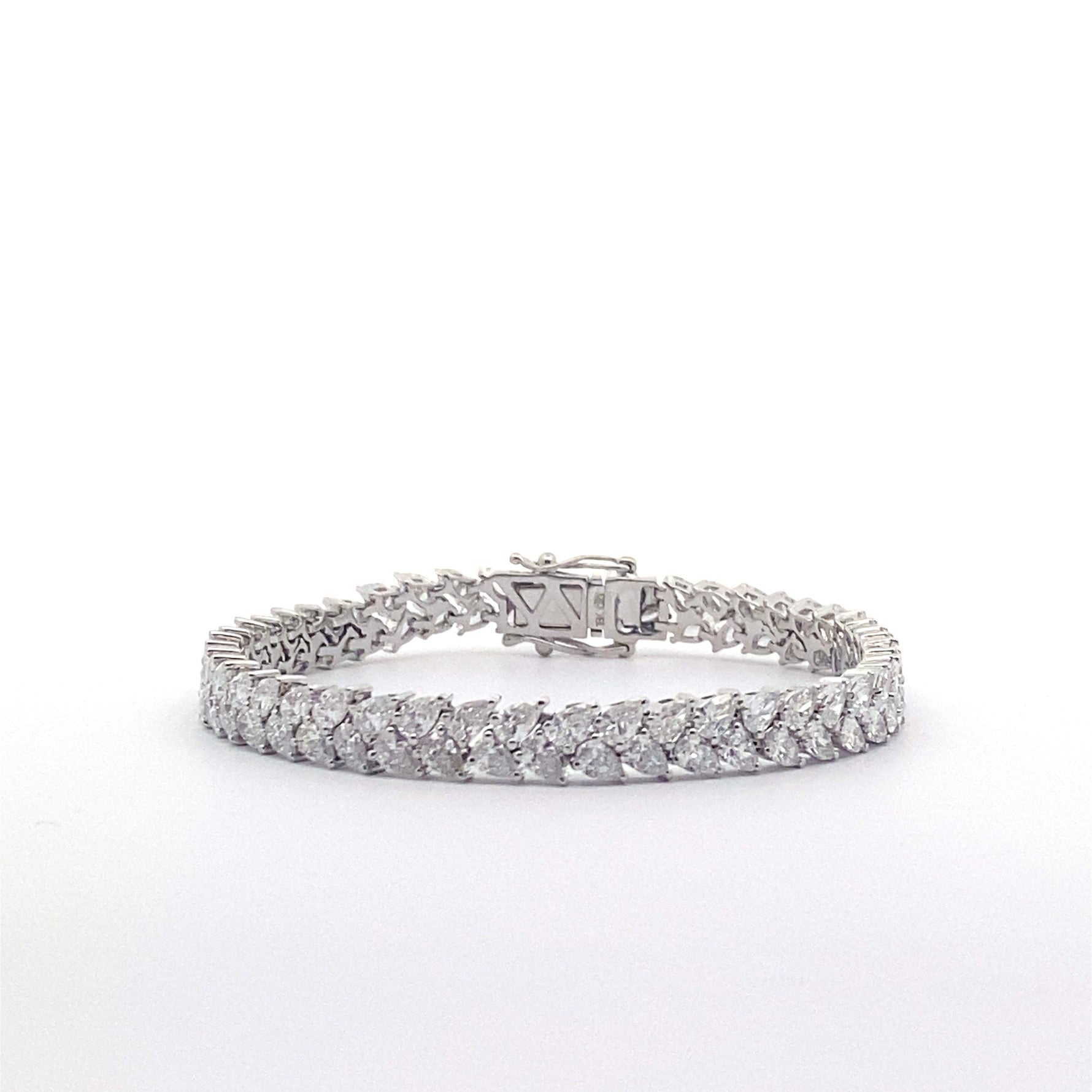 Graceful and eye-catching, this 18K white gold tennis bracelet features a flowing line of pear-shaped lab grown diamonds totaling 9.02 carats. Graded G in color and VS1 in clarity, each diamond is carefully matched to create a unique silhouette with elegant sparkle. A refined take on a classic style, this bracelet adds a touch of softness and sophistication to any collection. BRA-00002