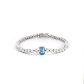 Unique and captivating, this 14K white gold tennis bracelet features a stunning mix of fancy blue and classic white lab grown diamonds. At its center is a 1.56 ct fancy blue emerald-cut diamond, paired with 3.49 carats of round brilliant white diamonds graded F in color and VS1 in clarity. With a total carat weight of 5.05, this bracelet is a striking blend of color, elegance, and modern sophistication. BRA-00033