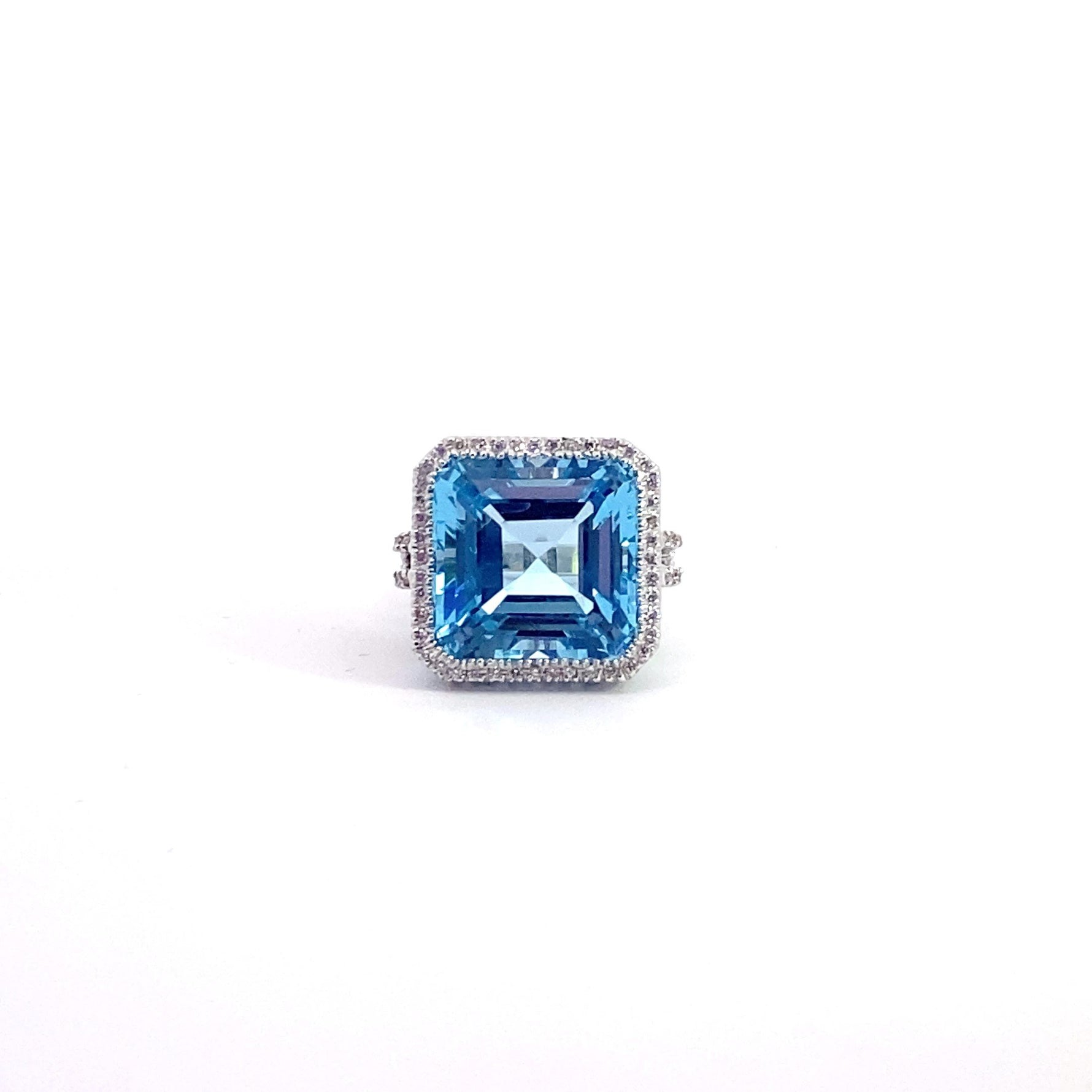 18K White Gold Asscher Cut Blue Topaz Italian Diamond Ring