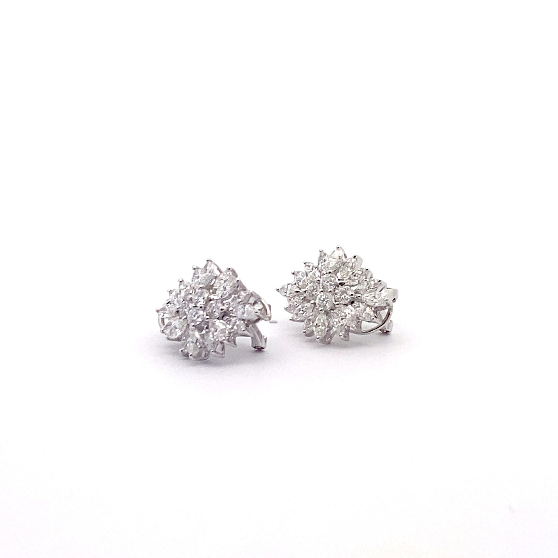 These 18K white gold earrings feature a floral-inspired cluster design crafted from marquise and round diamonds, totaling 4.00 carats. Graded G in color and VS1 in clarity, the diamonds are arranged to mimic the shape and symmetry of petals, creating a soft yet striking sparkle. A graceful statement piece with timeless elegance and delicate detail.