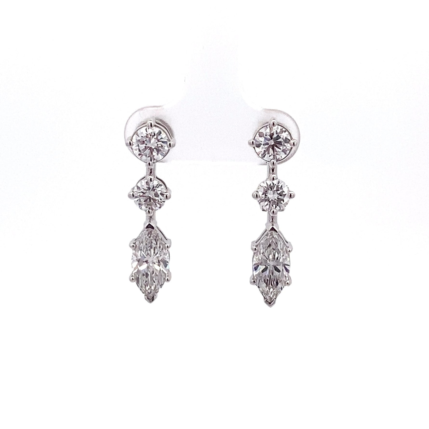 These 14K white gold drop earrings feature a graceful mix of marquise and round brilliant lab grown diamonds, totaling 4.84 carats. Graded F in color and VS1 in clarity, the diamonds are thoughtfully arranged in a flowing design that adds movement, sparkle, and elegance. A refined statement piece that beautifully balances classic charm with modern sophistication.