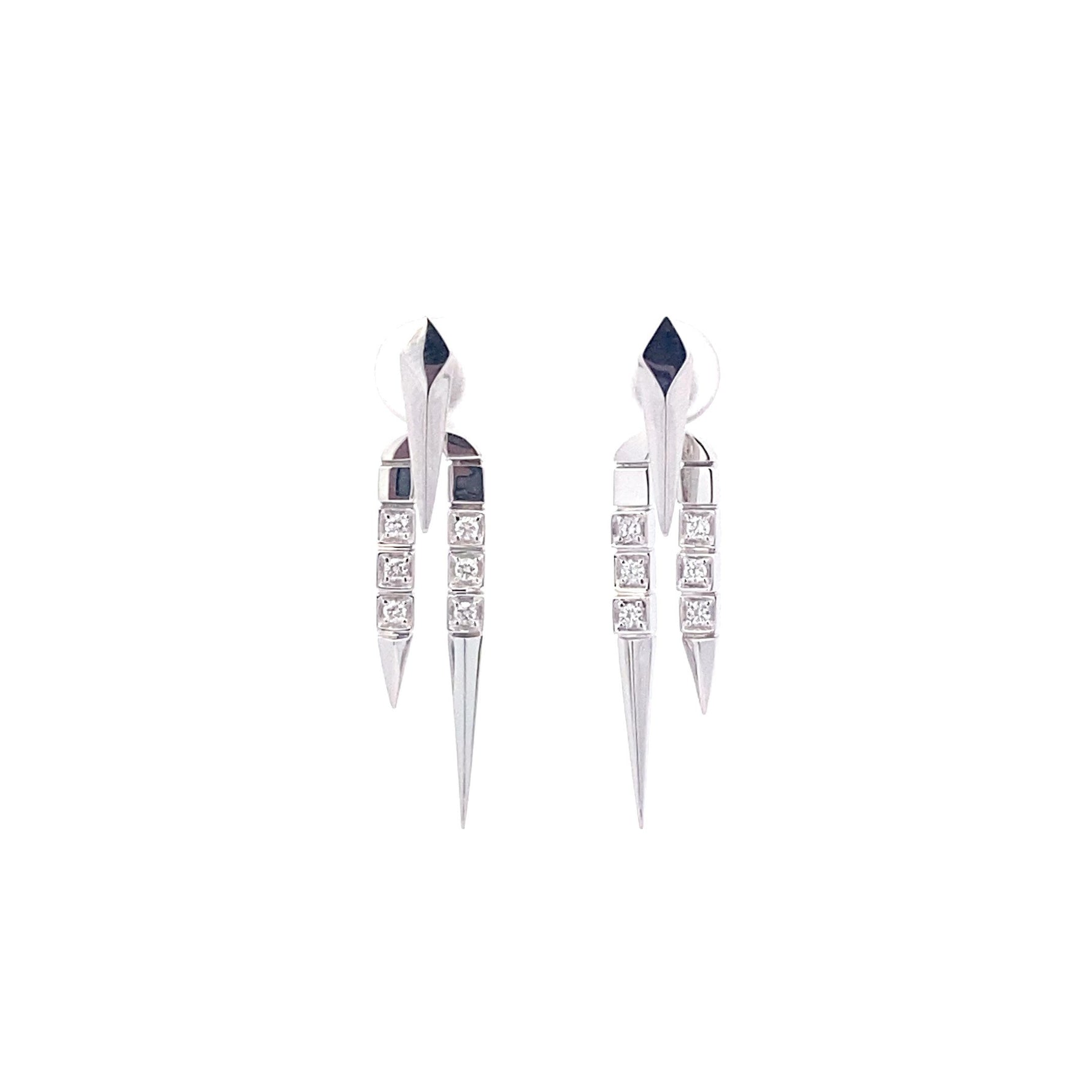 These 18K solid white gold earrings bring a bold, edgy vibe to fine jewelry with a sleek punk-inspired silhouette. Accented with 0.30 carats total of round brilliant diamonds, each stone is graded F in color and VS1 in clarity, offering clean, precise sparkle that contrasts beautifully with the structured design. Whether styled solo or layered with other pieces, they deliver a cool, modern look with just the right amount of luxury.