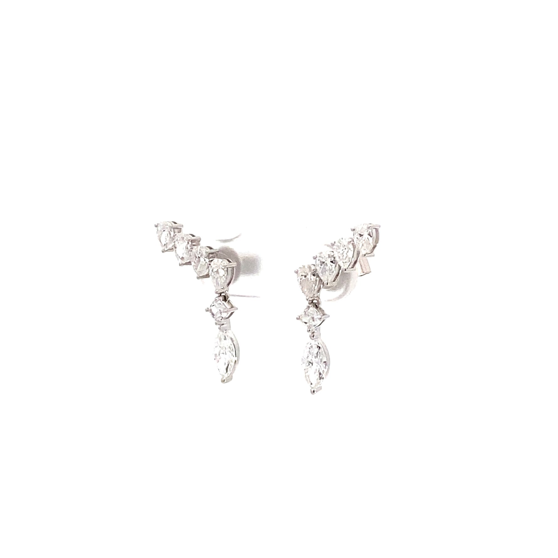 These 14K white gold earrings blend three elegant diamond shapes—pear, round, and marquise—in a unique climb and drop design totaling 2.00 carats. Graded F in color and VS1 in clarity, the lab grown diamonds are thoughtfully arranged to trace the ear with graceful brilliance before finishing in a soft drop. The mix of shapes adds depth and dimension, making this pair a refined yet eye-catching statement for both everyday wear and special occasions.