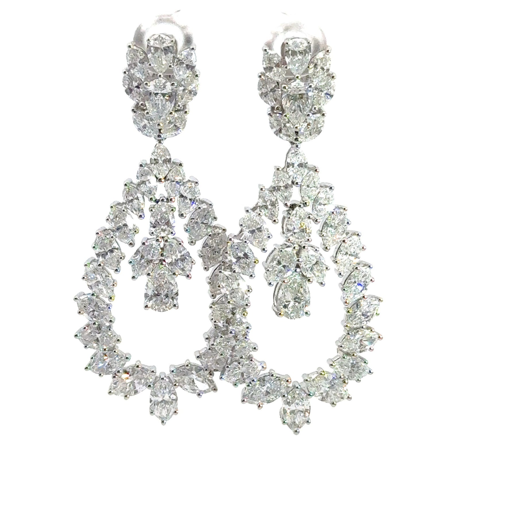 These 14K white gold dangling earrings are a true statement in elegance, featuring an impressive 13.38 carats total of pear and marquise shape lab grown diamonds. Graded F in color and VS1 in clarity, each diamond is hand-selected for its brilliance and perfectly arranged to create fluid, cascading movement. The combination of shapes adds dimension and drama, making this pair an exquisite choice for formal events or whenever you want your look to leave a lasting impression.