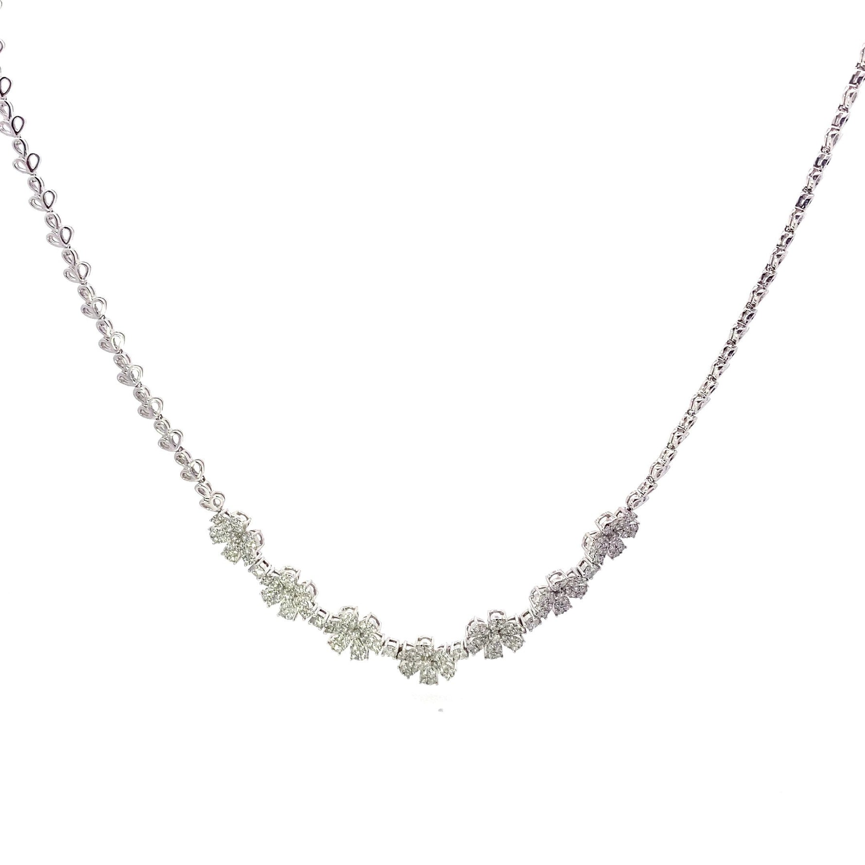 This breathtaking 14K white gold necklace features an elegant floral-inspired design, adorned with 7.00 carats total of dazzling round brilliant cut diamonds. Graded G in color and VS1 in clarity, each diamond is meticulously set to enhance its brilliance while forming a graceful and sophisticated arrangement. Crafted in an exquisite Italian style, this necklace exudes timeless charm, making it the perfect statement piece for special occasions or a luxurious addition to any fine jewelry collection.
