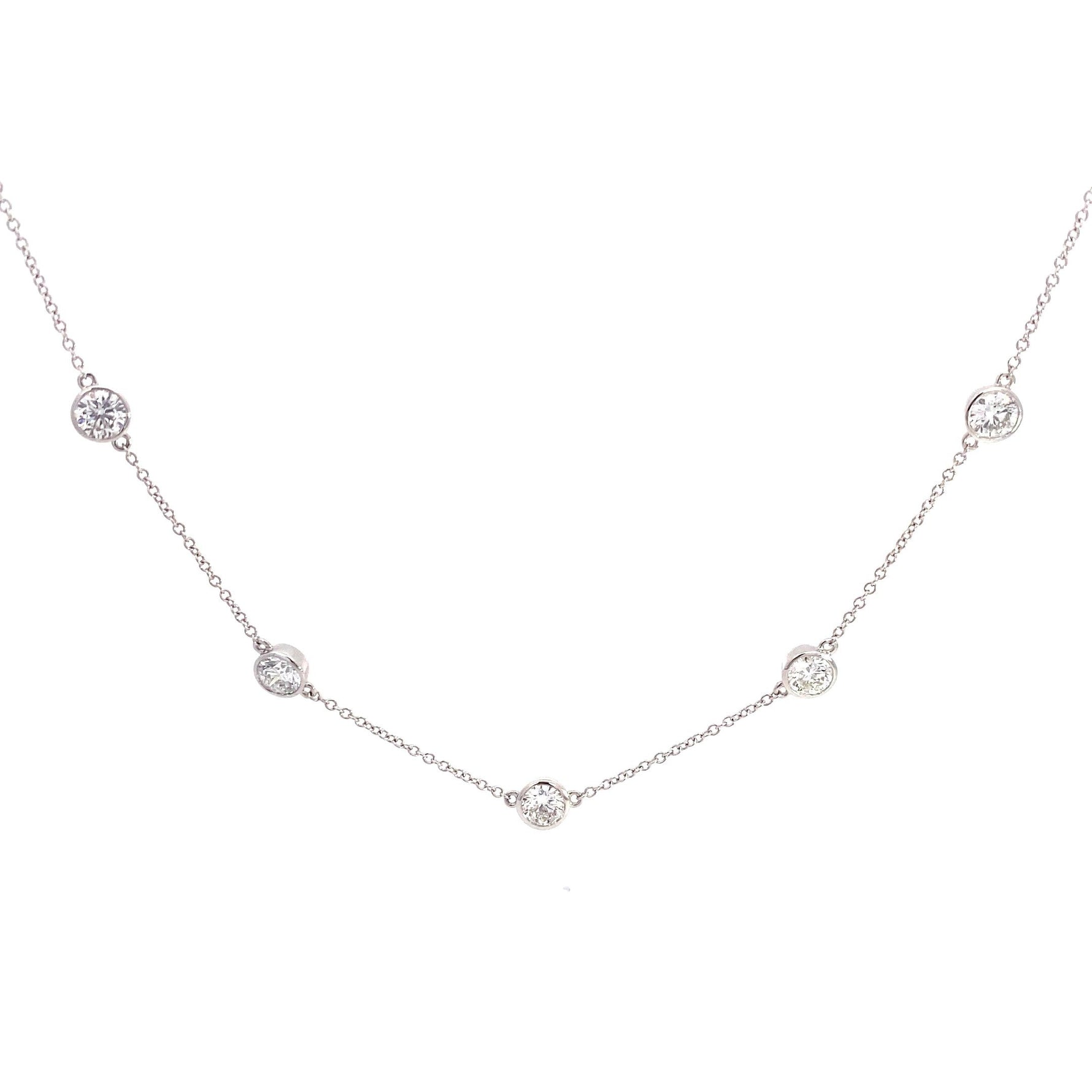 This exquisite 14K white gold Diamonds by the Yard necklace features 5.00 carats total of round brilliant cut diamonds, elegantly spaced along a delicate 16-inch chain. Graded F in color and VS1 in clarity, each diamond is meticulously bezel-set to maximize brilliance while maintaining a refined, airy design. Perfect for layering or wearing as a statement piece, this necklace blends timeless elegance with effortless sophistication.