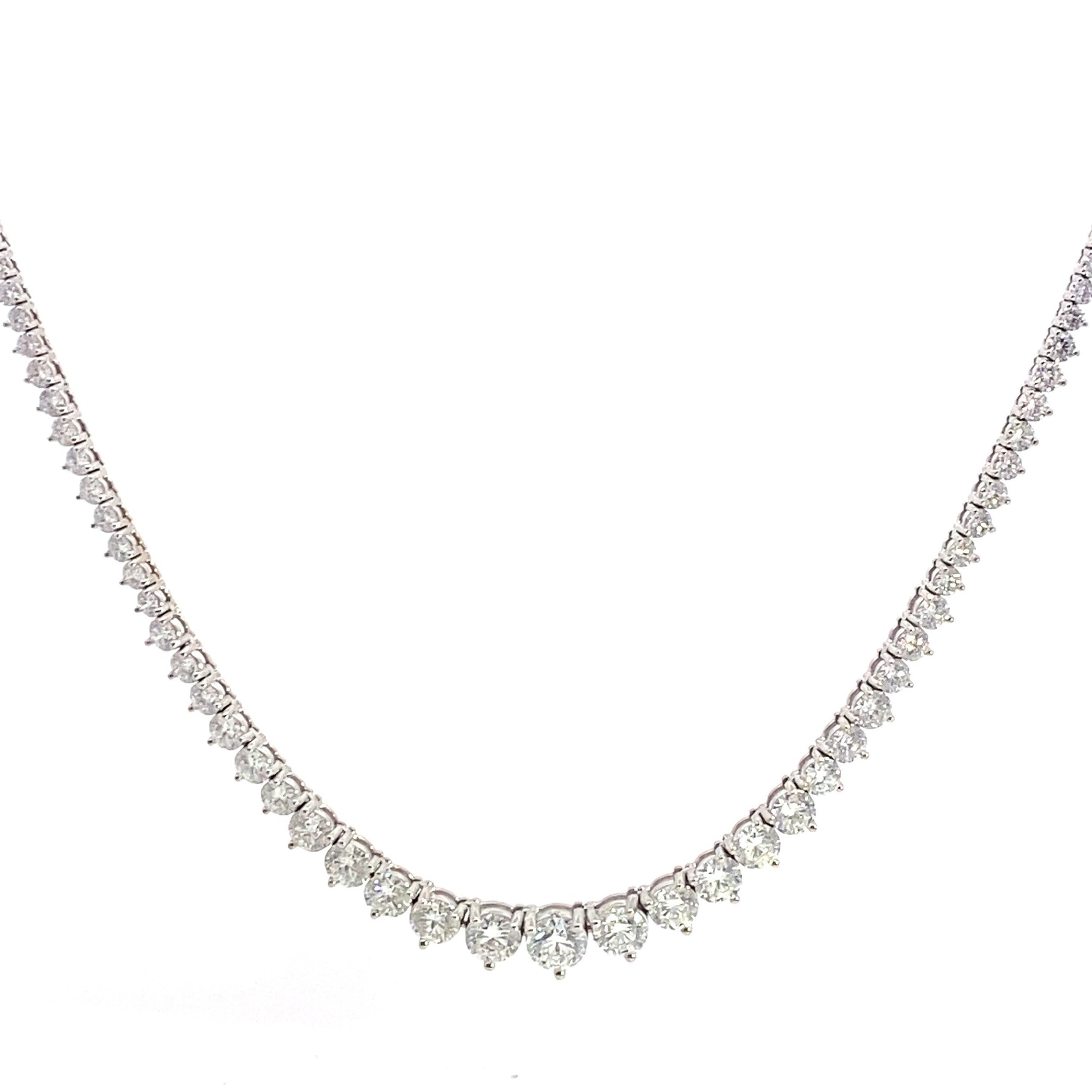 This stunning 14K white gold Riviera tennis necklace features a breathtaking graduated design, adorned with 19.00 carats total of round lab grown diamonds. Cut in a brilliant round style, each diamond is meticulously arranged to create a seamless cascade of radiance along the neckline. Graded F in color and VS1 in clarity, this necklace is a true statement of elegance and luxury, making it the perfect piece for special occasions or an opulent addition to any fine jewelry collection.