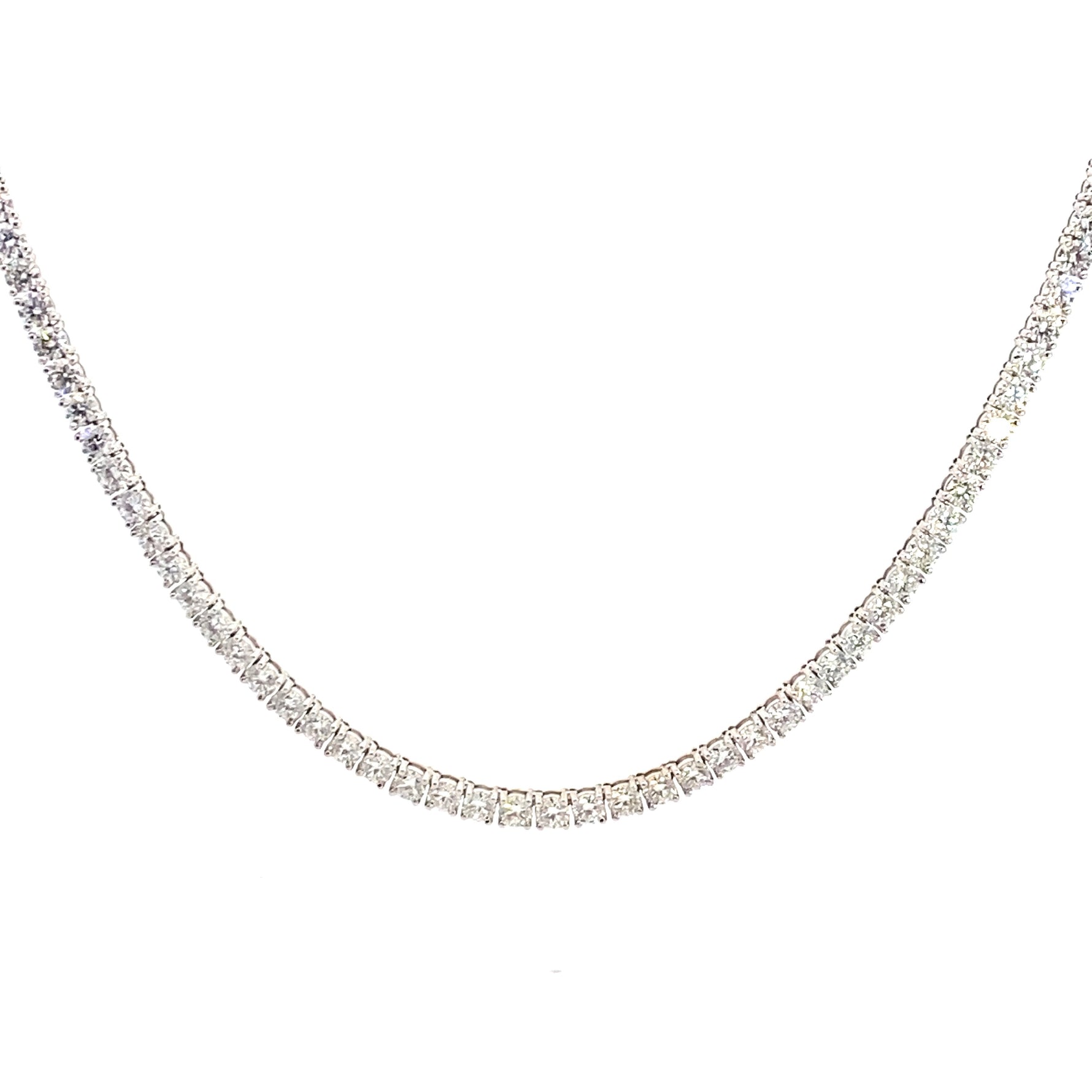 This stunning 14K white gold tennis necklace is adorned with 24.48 carats total of lab grown diamonds, meticulously set to create a seamless row of brilliance. Cut in a round brilliant style, these diamonds are graded F in color and VS1 in clarity, ensuring exceptional sparkle and fire. Designed for timeless elegance, this necklace is the perfect statement piece for special occasions or a luxurious addition to any fine jewelry collection.