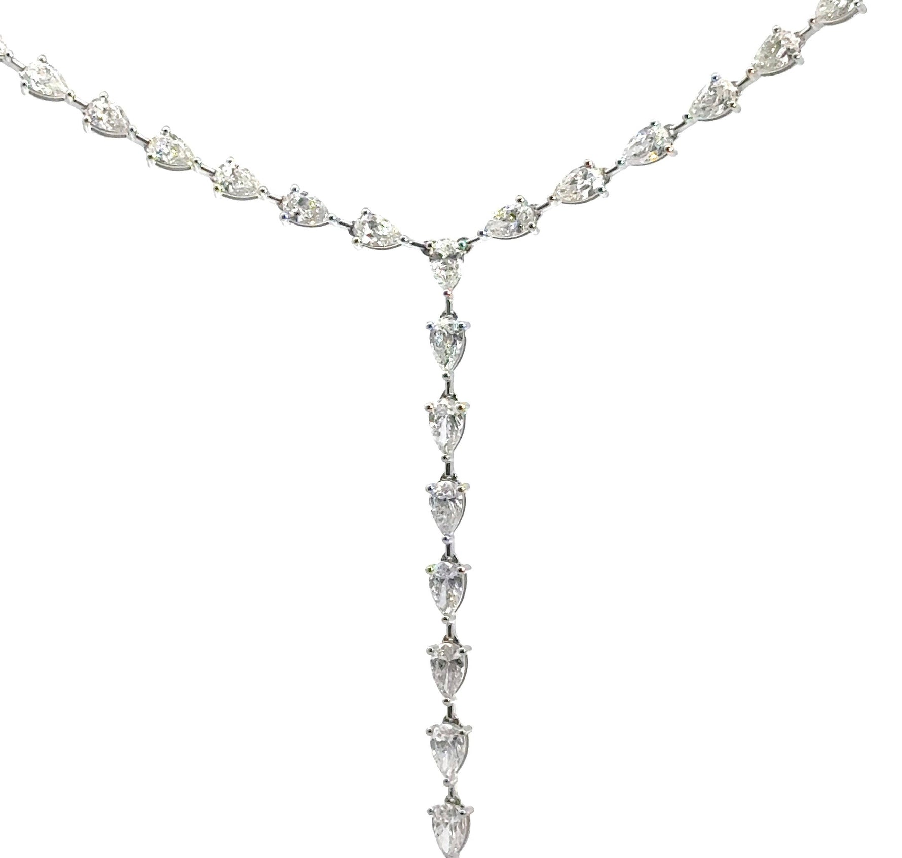 This breathtaking 14K white gold tie necklace showcases 14.34 carats total of pear shape lab grown diamonds, elegantly arranged to create a fluid and sophisticated silhouette. Graded F in color and VS1 in clarity, each diamond radiates exceptional brilliance, enhancing the refined design. The graceful drop effect of this piece makes it a striking statement, perfect for special occasions or as a luxurious addition to any fine jewelry collection.