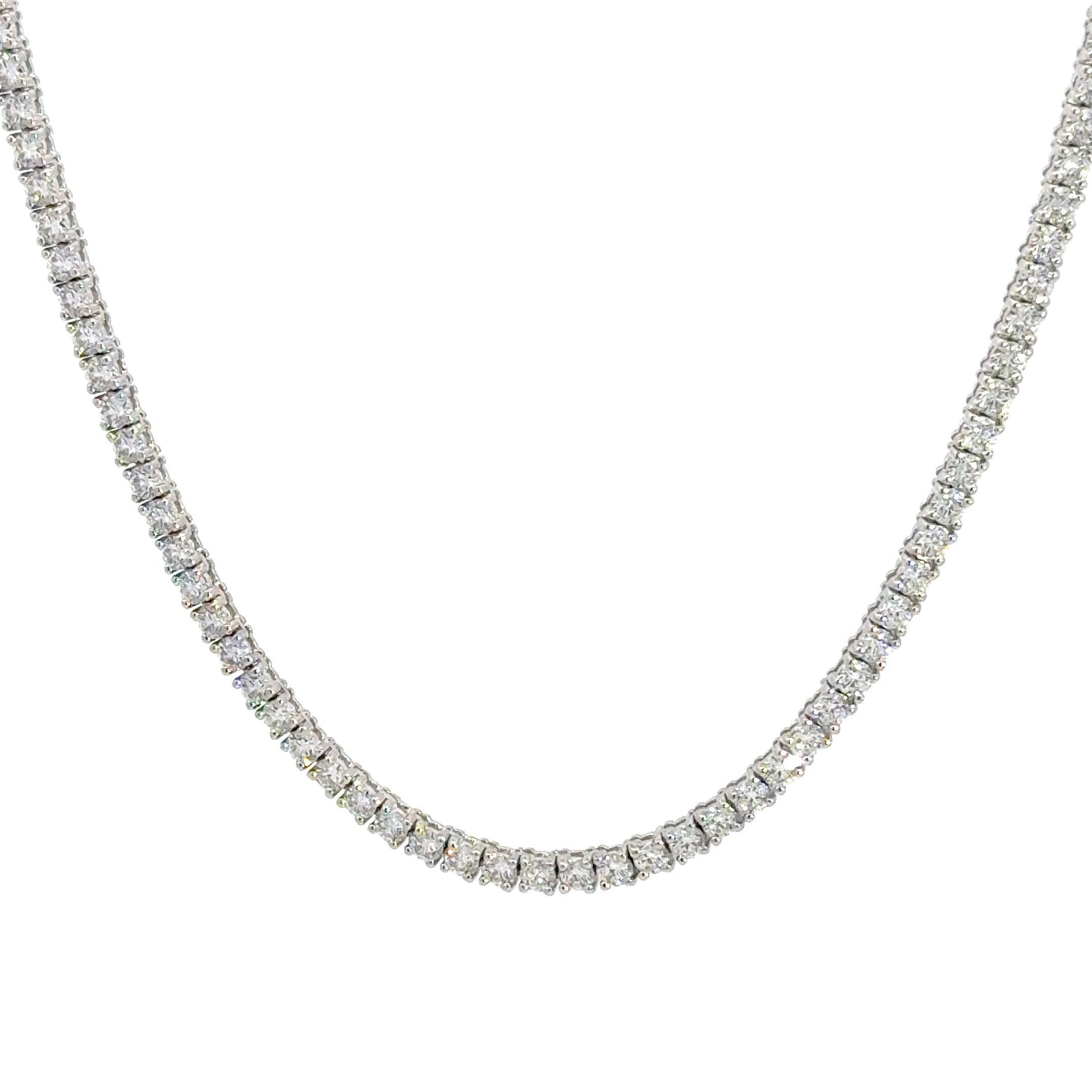 This exquisite 14K white gold tennis necklace is adorned with 7.02 carats total of round brilliant cut lab grown diamonds, each meticulously set to create a seamless display of brilliance. Graded F in color and VS1 in clarity, these diamonds radiate exceptional sparkle and elegance. Designed at 18 inches in length, this timeless necklace sits beautifully along the neckline, making it the perfect statement piece for special occasions or a luxurious everyday accessory.
