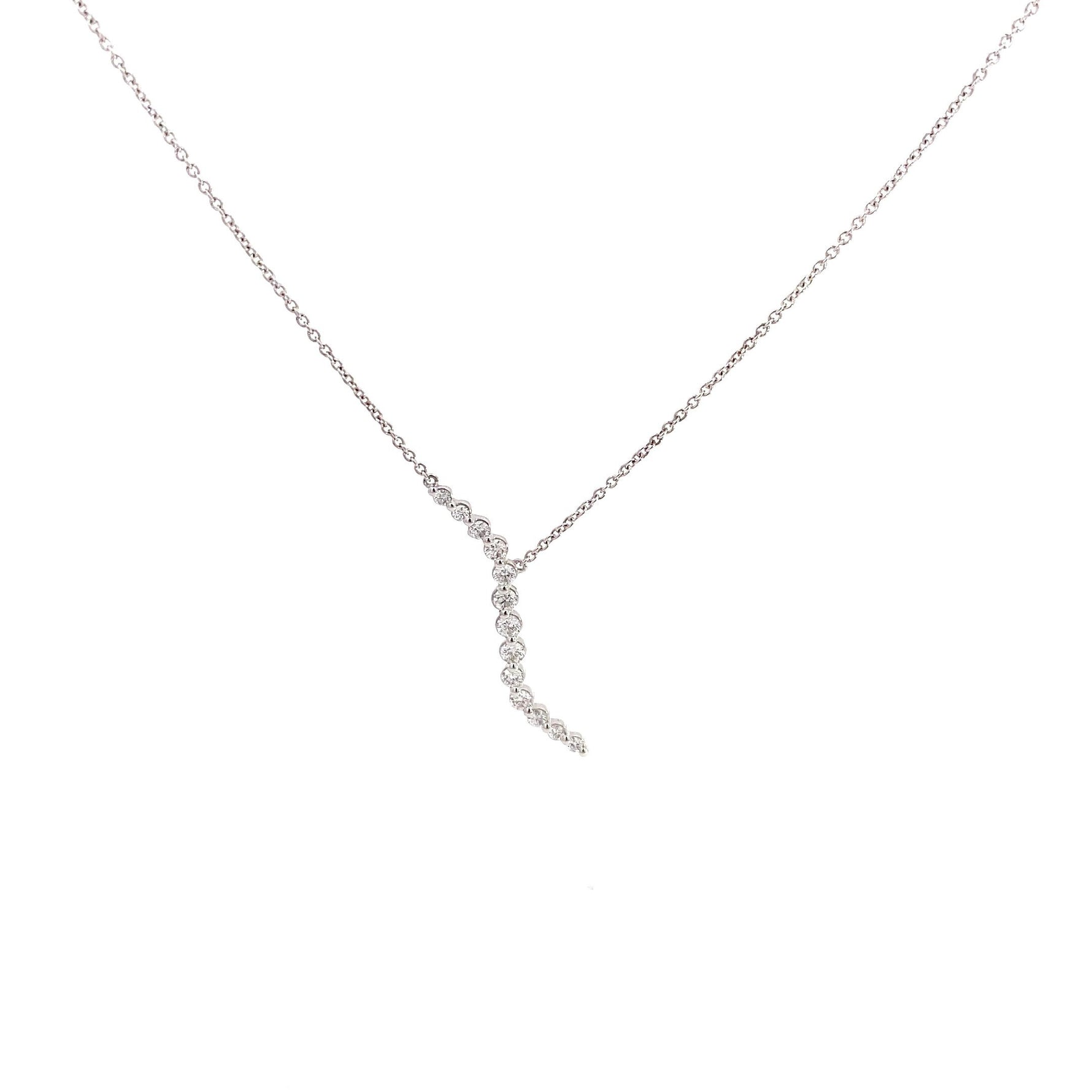 This elegant 14K white gold pendant features a delicate graduating drop design, adorned with 0.50 carats total of round brilliant cut lab grown diamonds. Graded F in color and VS1 in clarity, each diamond is meticulously arranged to create a seamless flow of brilliance. Sophisticated yet understated, this pendant is perfect for everyday elegance or as a refined accent for special occasions.