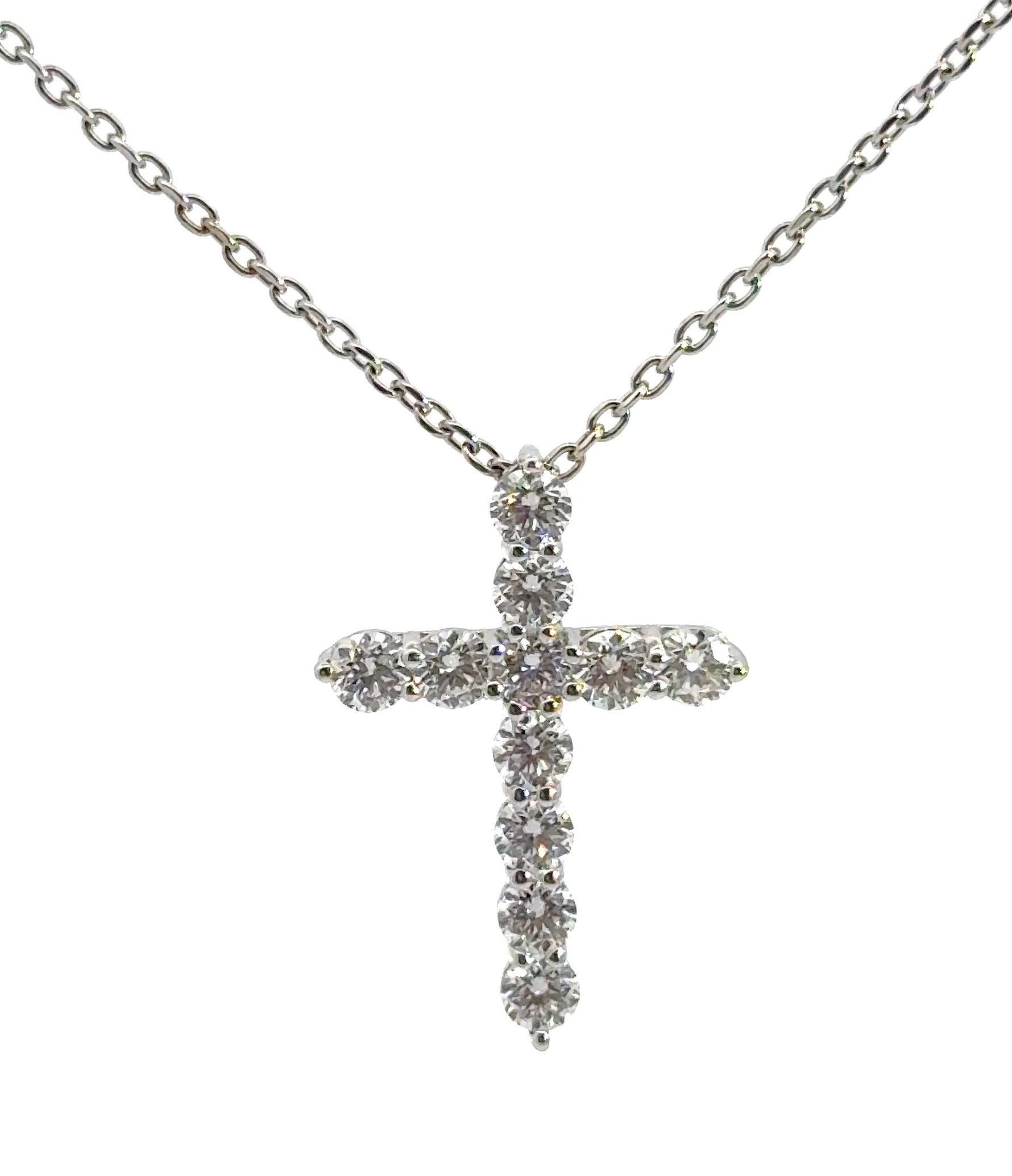 This radiant 14K white gold cross pendant is adorned with 1.25 carats total of round brilliant cut lab grown diamonds, thoughtfully arranged to enhance its luminous beauty. Graded F in color and VS1 in clarity, each diamond sparkles with exceptional brilliance, adding a touch of sophistication to this timeless symbol of faith. Whether worn daily or on special occasions, this pendant is a meaningful and elegant addition to any fine jewelry collection.