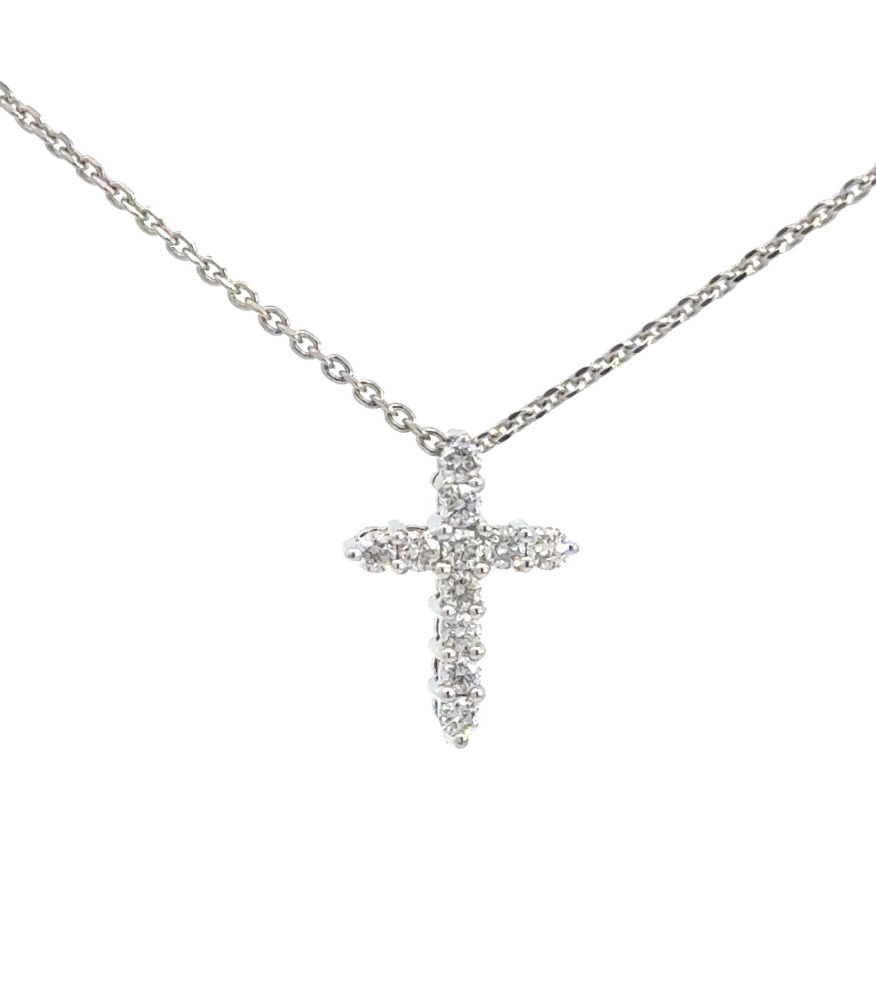 This elegant 14K white gold cross pendant is adorned with 0.50 carats total of round brilliant cut diamonds, meticulously set to create a radiant display of brilliance. Graded F in color and VS1 in clarity, each diamond enhances the timeless beauty of this symbolic design. A perfect blend of faith and sophistication, this pendant is ideal for everyday wear or as a meaningful gift.