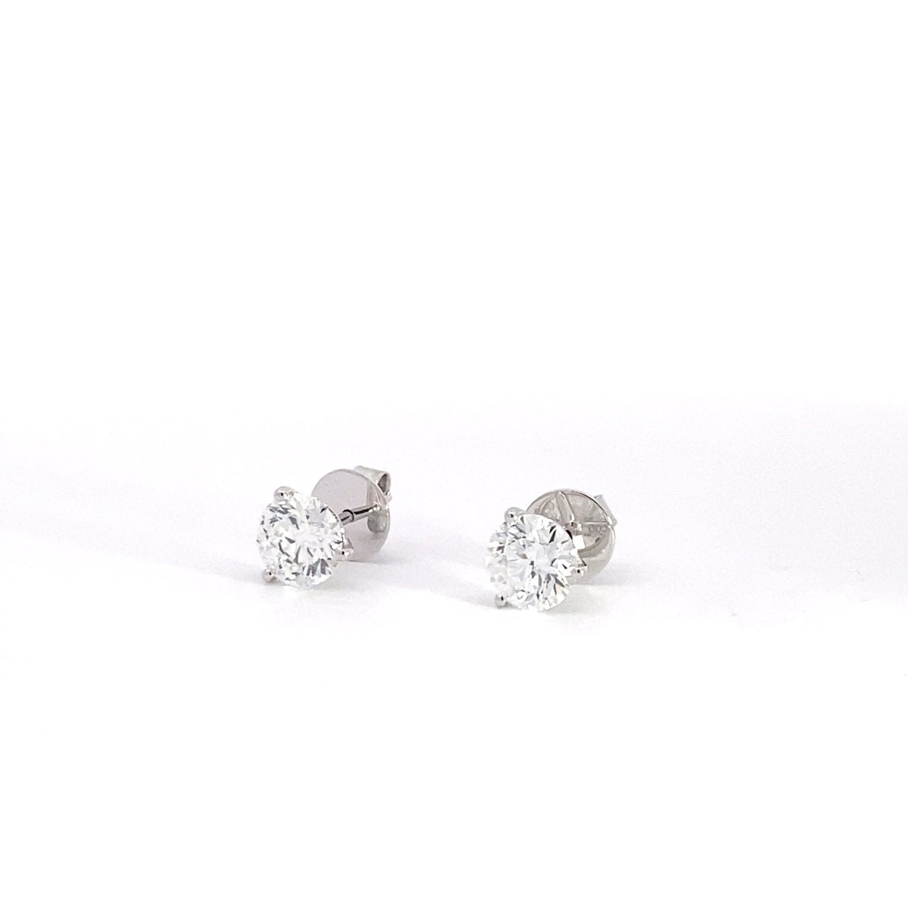 These 14K white gold stud earrings feature 2.14 carats total of round brilliant cut lab grown diamonds, graded F in color and VS1 in clarity. Set in sleek 3-prong martini settings, the design allows the diamonds to sit close to the ear while maximizing brilliance from every angle. Elegant and timeless, these earrings are perfect for everyday sophistication or adding a refined touch to any special moment.
