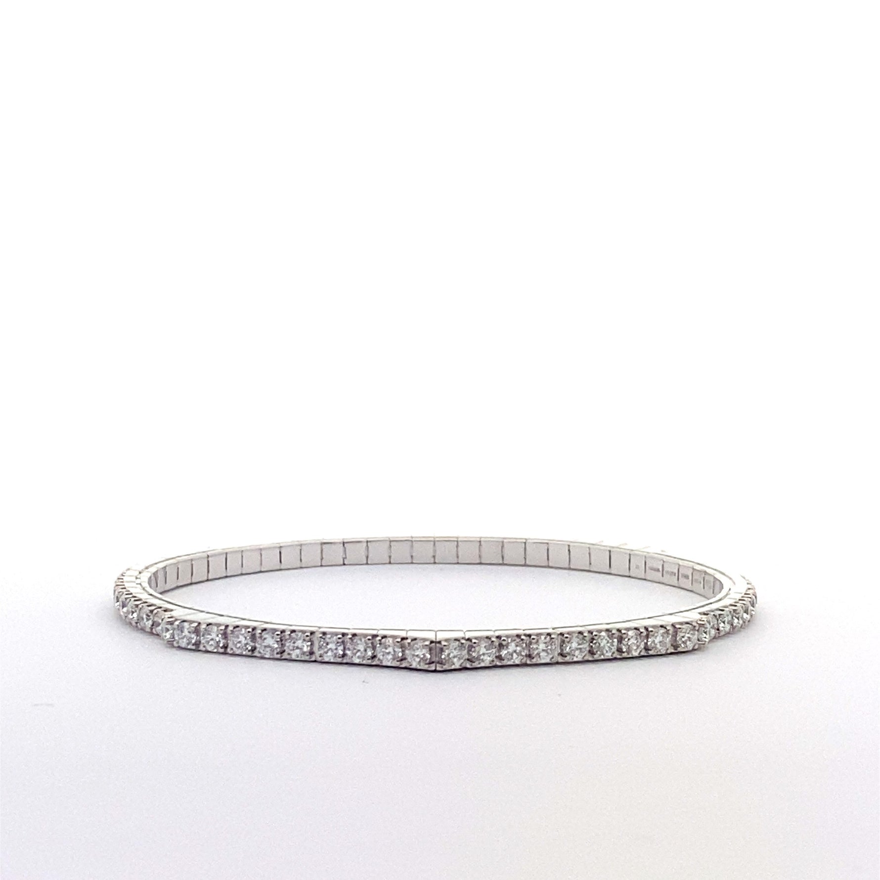 Elegant with a touch of modern comfort, this 18K white gold stretch bracelet features 3.70 carats of round-shaped fancy diamonds that bring soft brilliance to the wrist. Graded F in color and VS1 in clarity, each diamond is carefully set to offer a seamless, flexible fit without compromising on luxury. Perfect for everyday elegance or layering, this bracelet is timeless, wearable, and effortlessly refined. BRA-00021