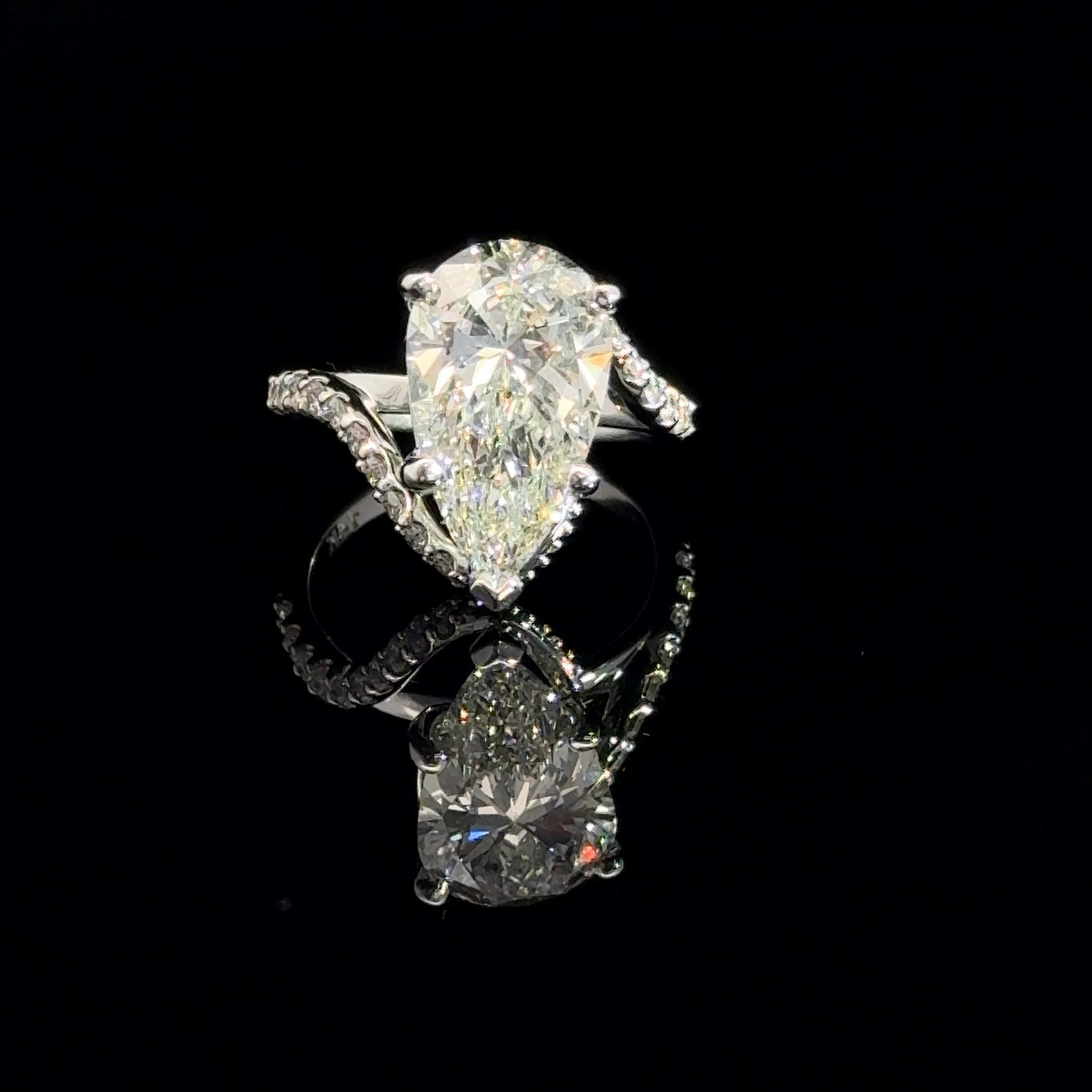 Sculptural and expressive, this 4.41 cttw pear shape bypass engagement ring curves elegantly around the finger in 14K white gold. A bold take on timeless romance, it’s crafted to feel fluid, modern, and utterly unforgettable.