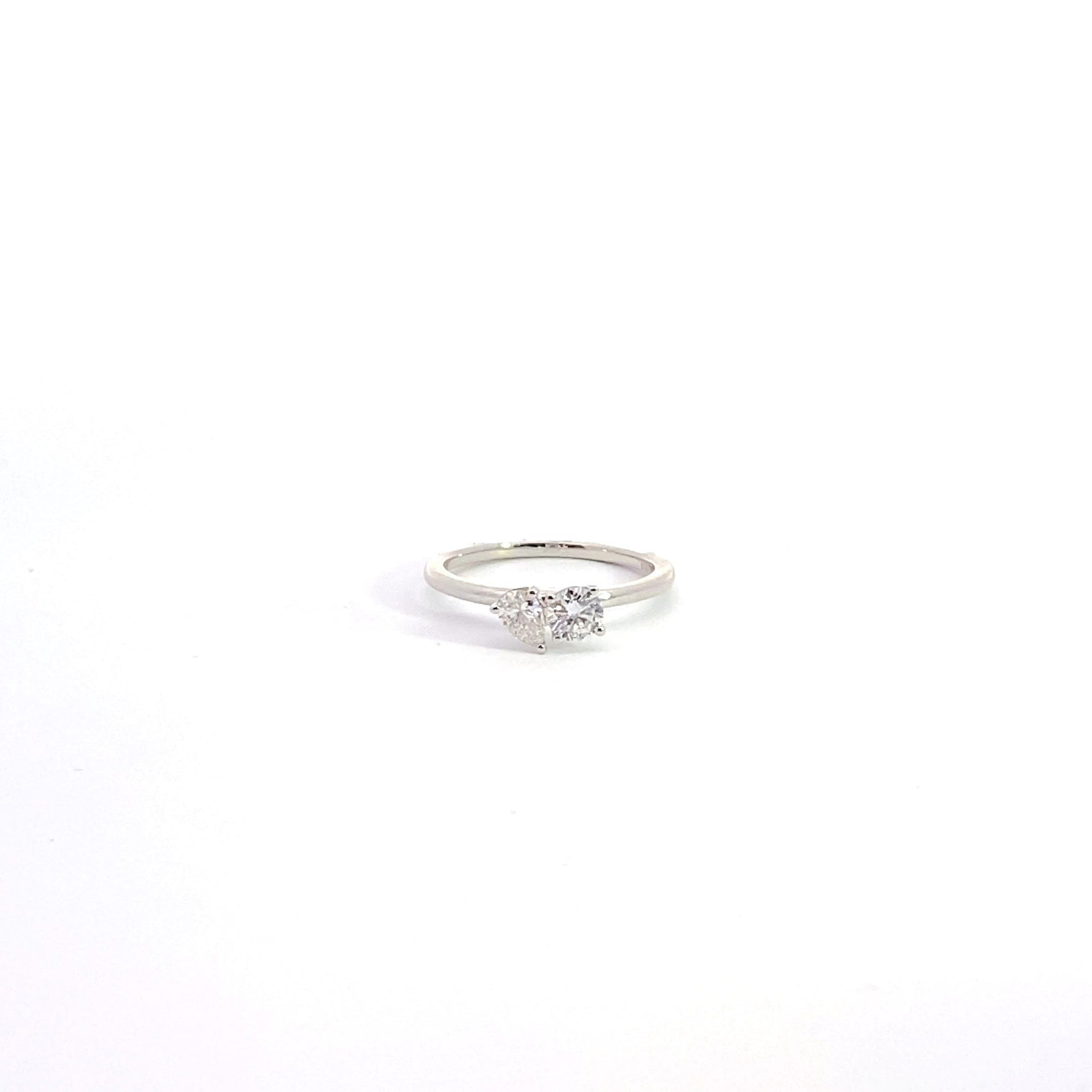 Chic and full of charm, this two-stone ring pairs classic sparkle with a playful twist. Crafted in polished 14K white gold, it brings together a round brilliant and a pear-shaped lab-grown diamond, totaling 0.50 carats. The combination of cuts creates a soft, balanced contrast that feels both modern and timeless. With F-color and VS1 clarity, each diamond glows with purity and light—making this ring a graceful symbol of connection, harmony, and style.