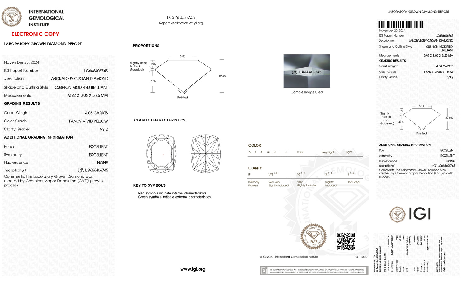 4.08CT CUSHION ELONGATED CUT FANCY VIVID YELLOW LAB GROWN LOOSE DIAMOND FANCY VIVID YELLOW IN COLOR VS2 IN CLARITY IGI CERTIFIED: 666406745
