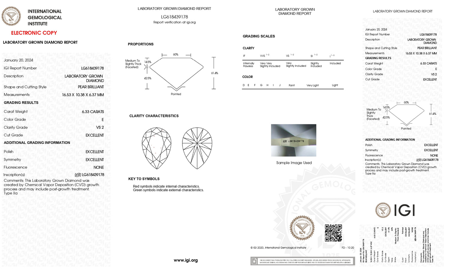 6.33 CT Pear Shape Lab Grown Loose Diamond E VS2 – IGI Certified