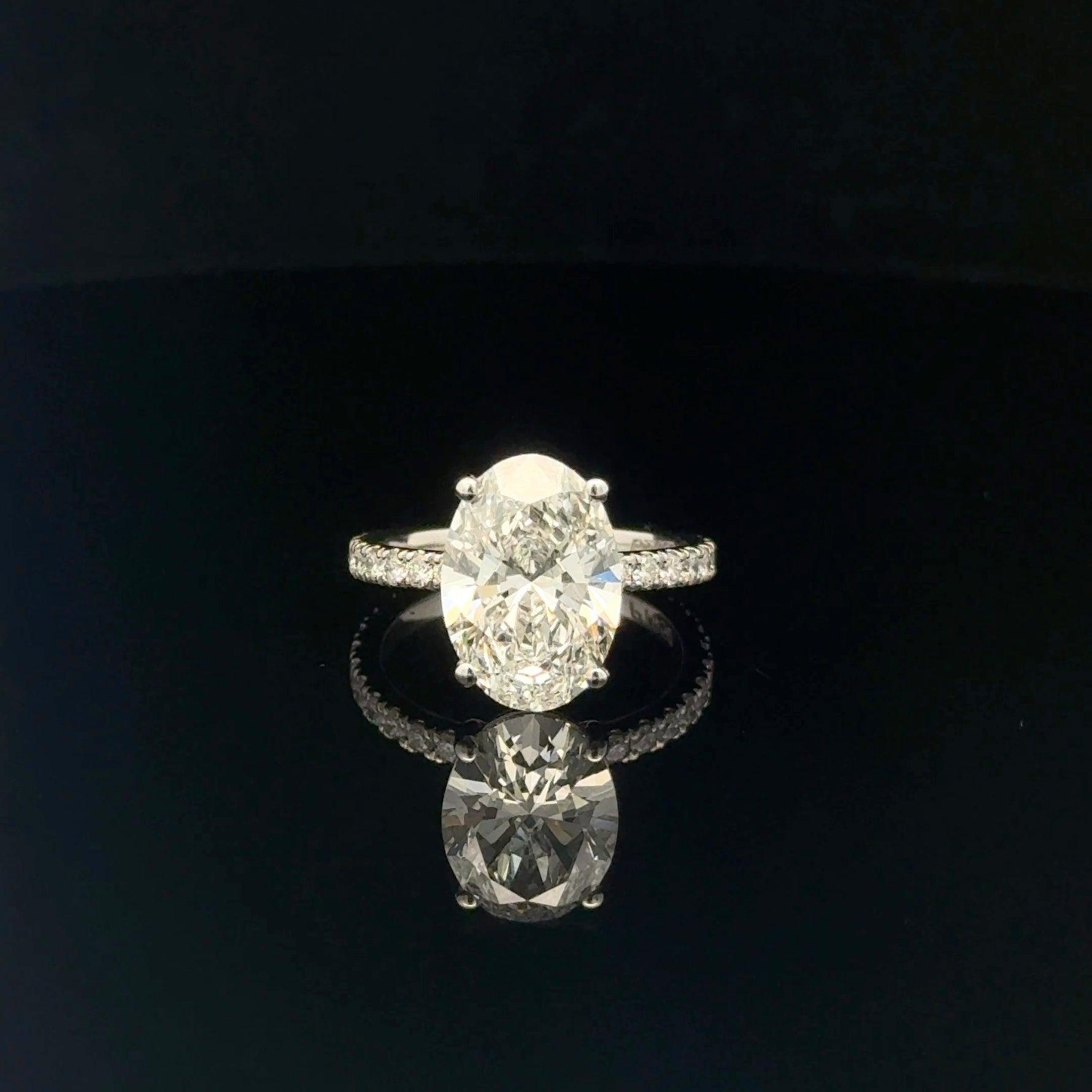 Elegant by design, this 4.63 cttw oval cut engagement ring stuns in sleek platinum. Its elongated silhouette and luminous presence evoke timeless glamour—crafted to be felt, not just seen.