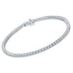 A single row of sparkling brilliant cut diamonds is set in beautiful shared 14kt white gold four prong settings in this sparkling lab diamond tennis bracelet with a total weight of approx 2 carats. The sturdy lock hugs your wrist gently while dazzling diamonds flow and sparkle flexibly with every move.