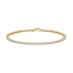 This 14kt yellow gold tennis bracelet with a total weight of approx 2 carats features a single row of sparkling brilliant cut diamonds set in a shared four prong setting. A set of firm, sturdy locks hugs your wrist gently while the dazzling diamonds sparkle beautifully.