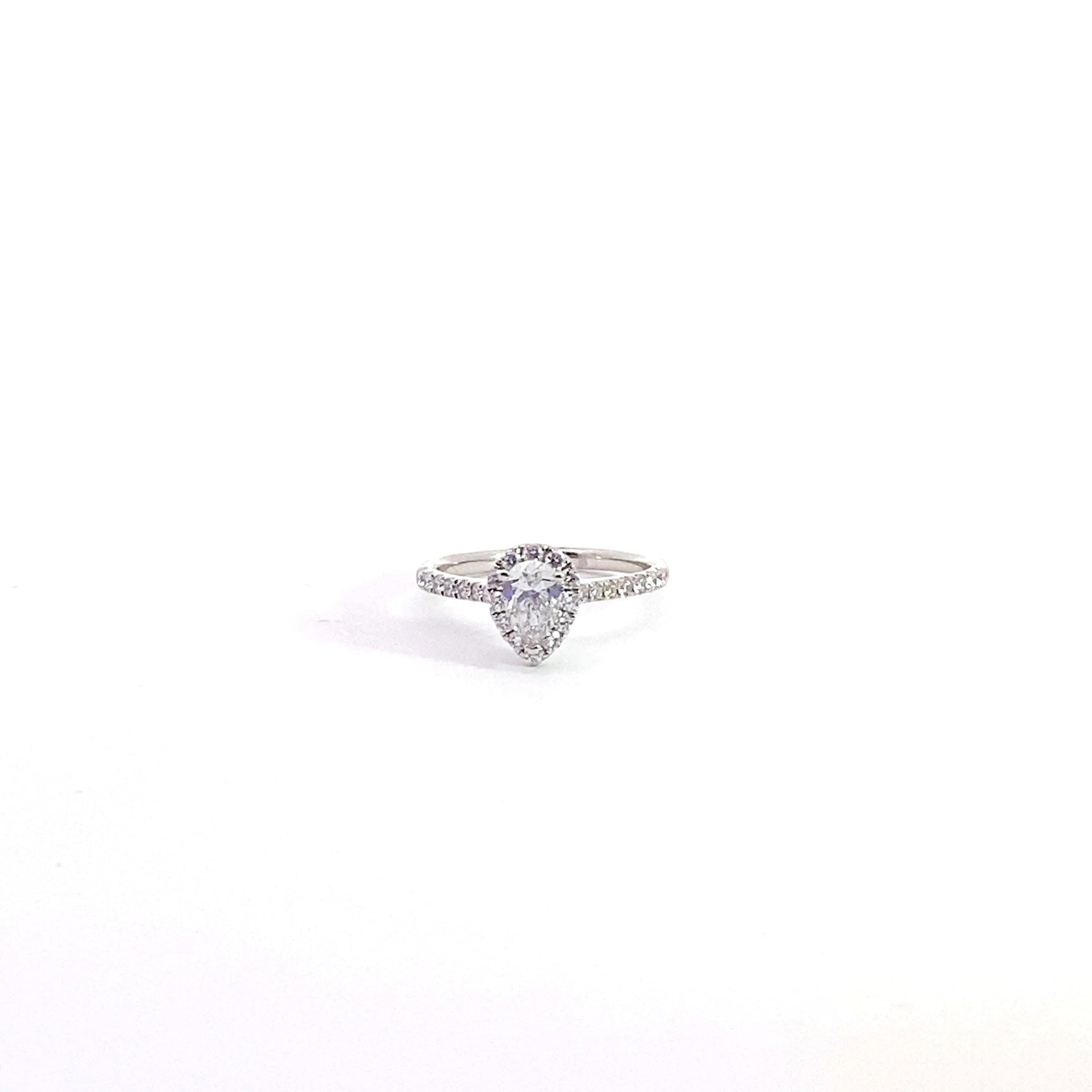 Disfrute del lujo con nuestro anillo de compromiso de oro blanco de 14k con halo de diamantes cultivados en laboratorio y forma de pera. Con una deslumbrante piedra central de 0.90 quilates y un peso total adicional de 0.50 quilates de diamantes brillantes redondos engastados, este anillo irradia sofisticación y elegancia. Elaborado con diamantes de color F y claridad VS1, es un símbolo atemporal de su amor. ENG-00002