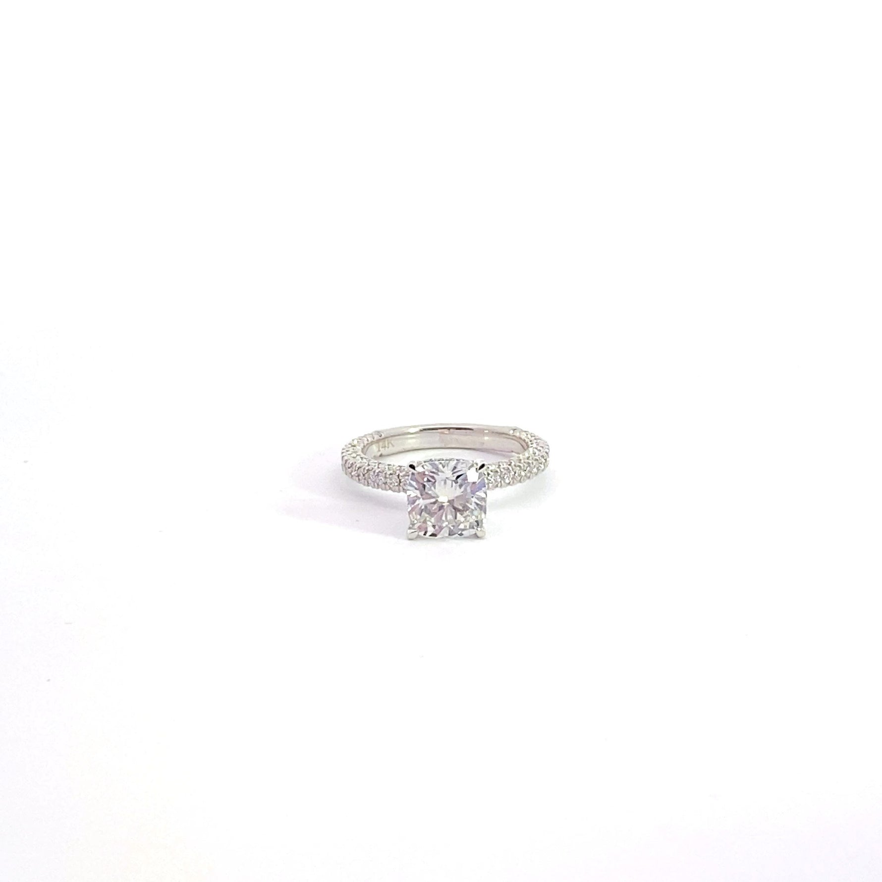 Consiéntase con el símbolo supremo del amor con nuestro anillo de compromiso de oro blanco de 14k con diamantes cultivados en laboratorio de talla cojín. Elaborado con una impresionante piedra central de 3,1 quilates y 0,91 quilates de diamantes color F y claridad VS1 engastados, este anillo irradia sofisticación y lujo. Realce su historia de amor con esta exquisita pieza. ENG-00003