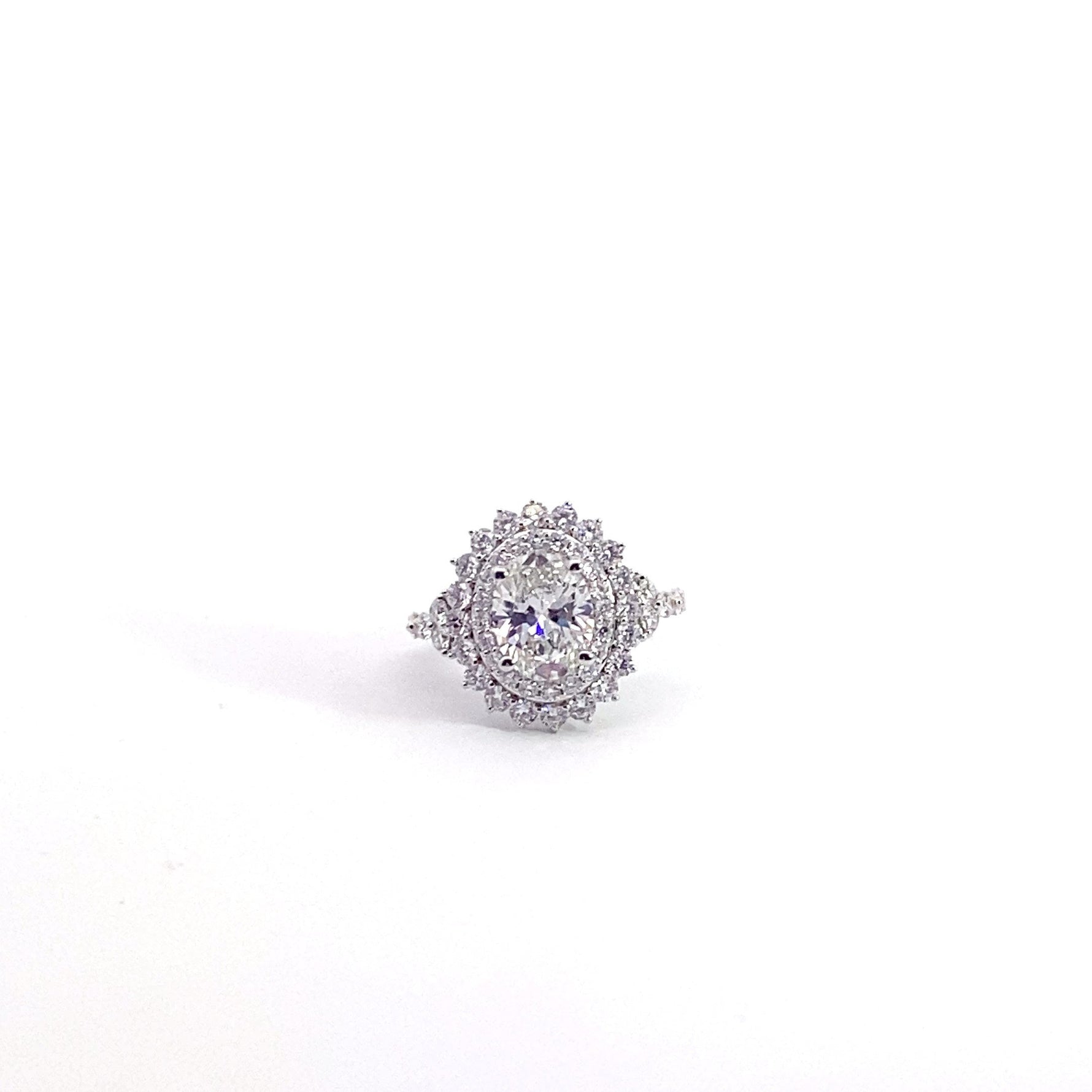 Elegante y con carácter, este anillo de compromiso de oro blanco de 18 quilates luce un impresionante diamante ovalado de 2,00 ct cultivado en laboratorio en el centro, que irradia un brillo sutil. Con grado de color F y claridad VS1, la piedra central se complementa a la perfección con diamantes redondos brillantes cultivados en laboratorio a lo largo del engaste, lo que eleva el peso total en quilates a 3,50. Una refinada fusión de forma y brillo, este anillo es una celebración atemporal del amor. ENG-00012