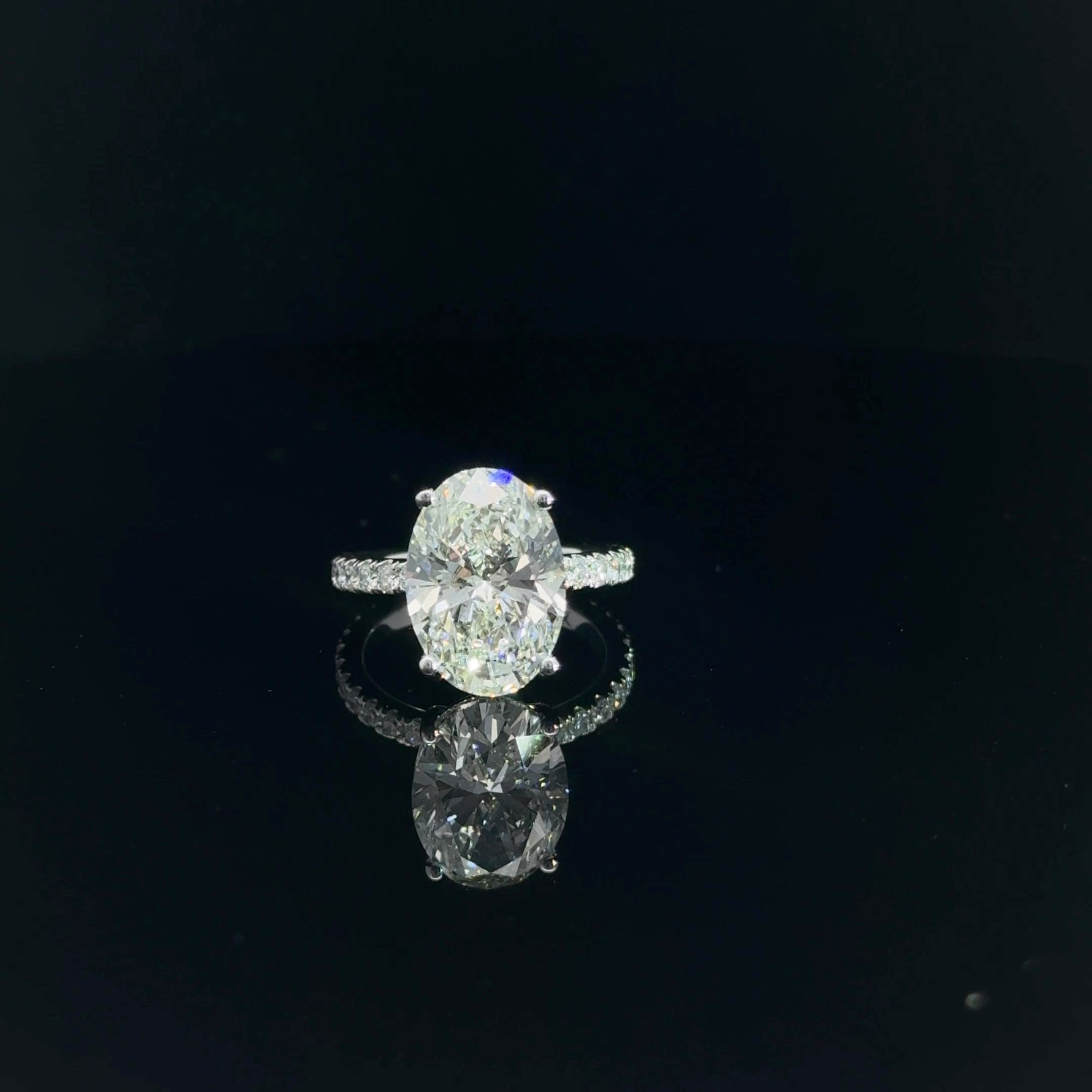 Elegante y con gracia, este anillo de compromiso de oro blanco de 18 quilates luce un magnífico diamante ovalado de 5,09 quilates, cultivado en laboratorio, que irradia un brillo atemporal. La banda está adornada con 0,46 quilates de diamantes redondos cultivados en laboratorio, que aportan un suave brillo a lo largo del cuerpo. Con grado de color F y claridad VS1, la piedra central cuenta con la certificación IGI (Certificado n.º 614320431), lo que garantiza belleza y calidad. Con un peso total de 5,55 quilates y un tamaño de 4,5, esta pieza evoca una sensación de lujo refinado y duradero. ENG-00041
