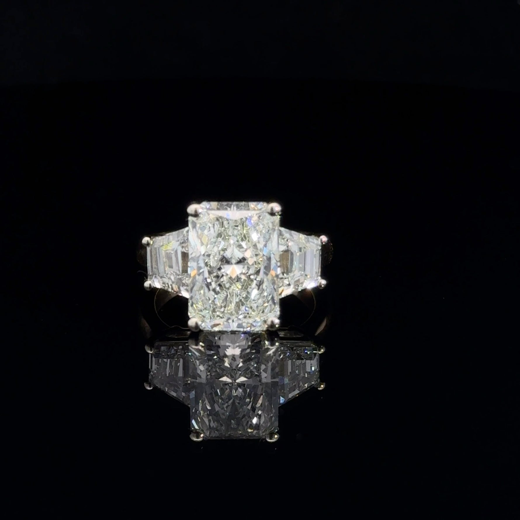 Audaz, luminoso y atemporal, este anillo de compromiso de 3 piedras es una impactante expresión de amor. Engastado en cálido oro amarillo de 14 quilates, luce un impresionante diamante central de 4,58 quilates, de talla radiante y cultivado en laboratorio, con certificación IGI, flanqueado por dos piedras laterales trapezoidales perfectamente alineadas que suman un total de 2,00 quilates. Todos los diamantes son de color F y claridad VS1, ofreciendo una intensidad y claridad excepcionales. Con un peso total de 6,58 quilates, este anillo ofrece un brillo intenso con una elegancia refinada. Certificado IGI n.° 632477901.