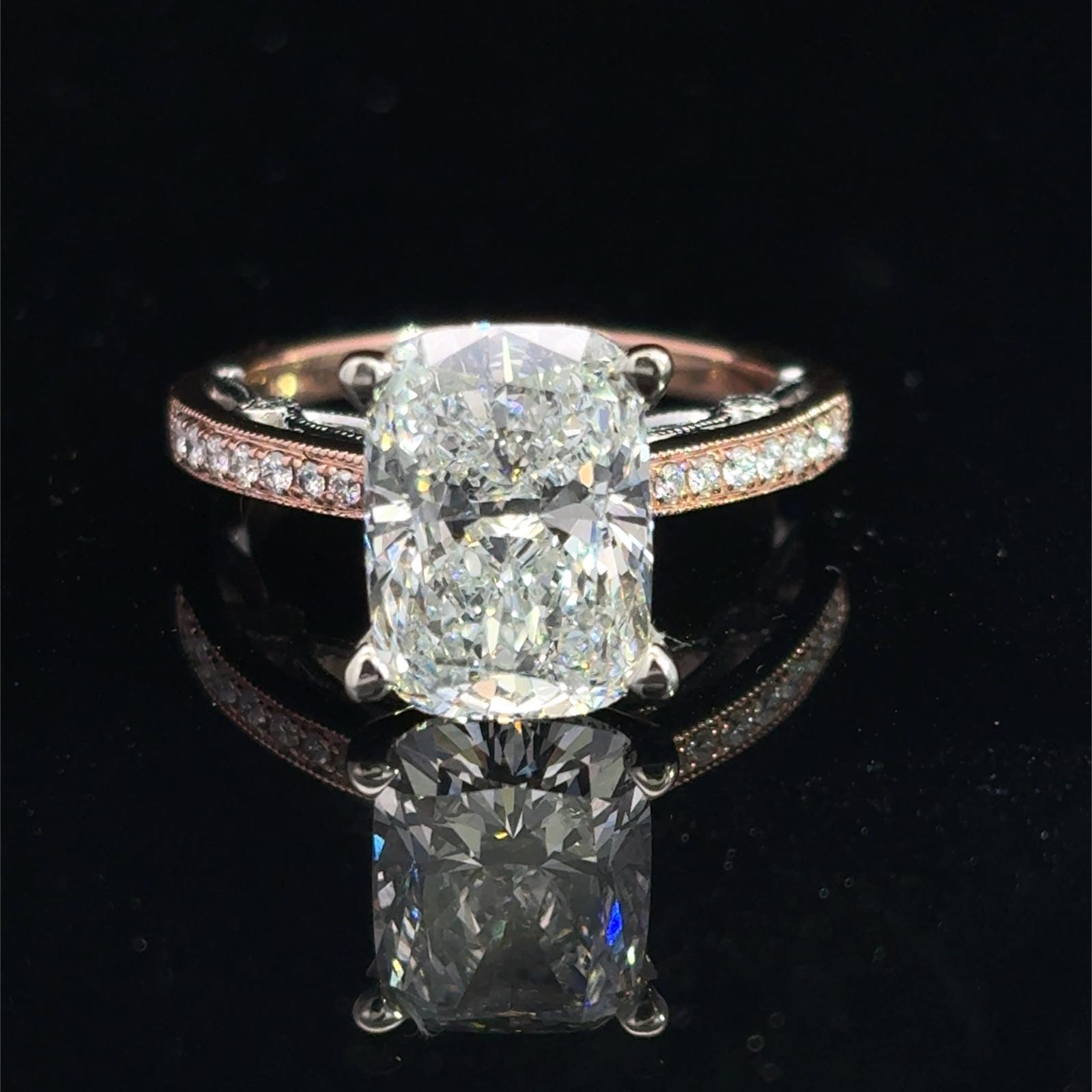 An extraordinary 14K Two Tone Gold Engagement Ring showcasing a 4.10ct elongated cushion cut lab grown diamond of F color and VS1 clarity. IGI certified (651408549), this masterpiece radiates timeless romance and modern brilliance — crafted as a symbol of elegance, devotion, and forever.