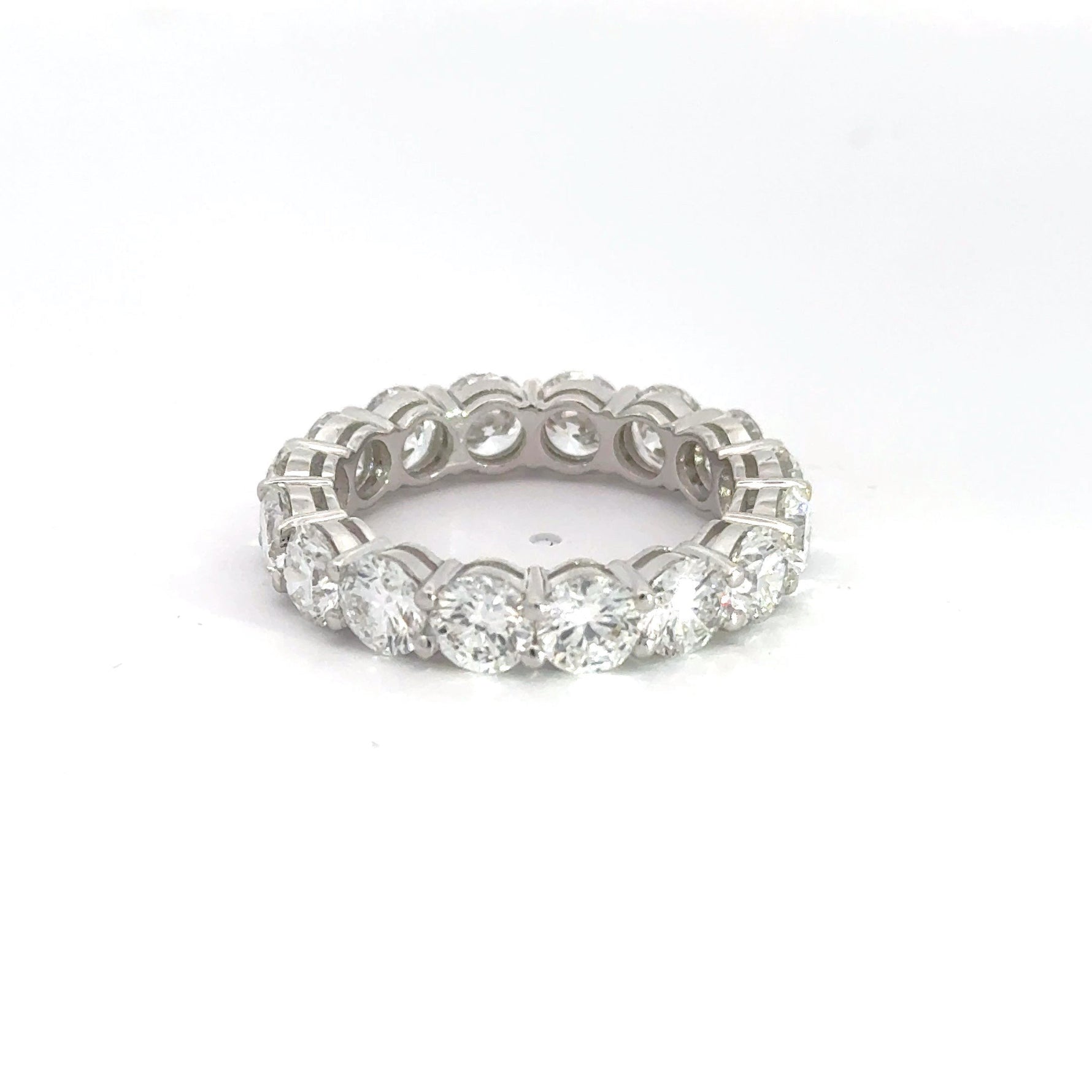 Impresionante por su simplicidad, esta alianza de eternidad de oro blanco de 18 quilates presenta un círculo continuo de diamantes redondos brillantes cultivados en laboratorio con un total de 6,82 quilates. Cada diamante tiene una clasificación de color E y una claridad VS2, ofreciendo un brillo excepcional con una estética atemporal y equilibrada. Con un tamaño de 8,5, esta alianza es perfecta para celebrar un hito o simplemente para añadir un toque de brillo a tu día a día.
