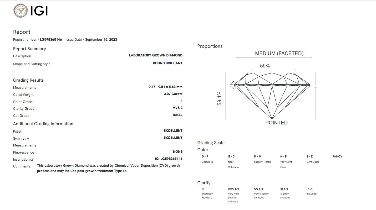 Diamante suelto cultivado en laboratorio de talla brillante redonda de 3,07 quilates con certificación IGI