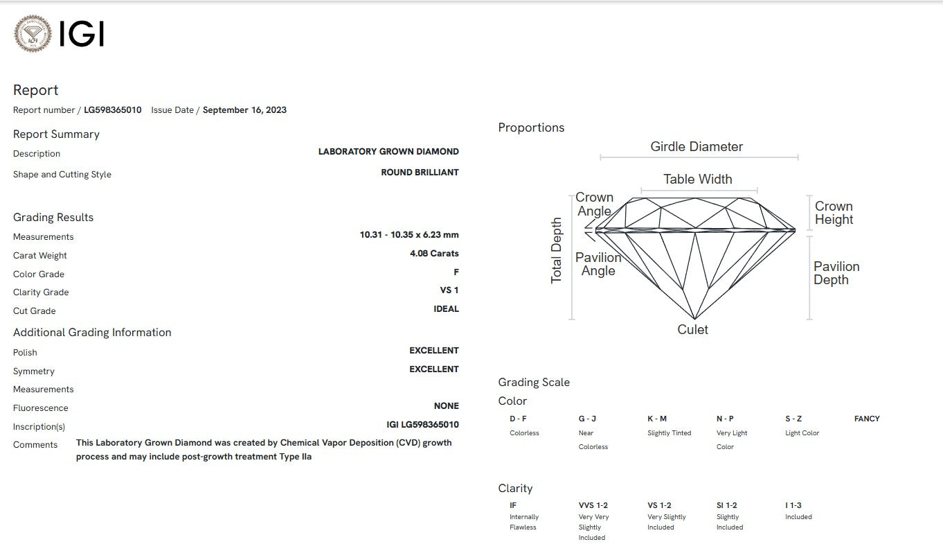 Este es el informe que detalla las características únicas de su diamante, emitido por IGI, uno de los laboratorios gemológicos más reconocidos y confiables del mundo.