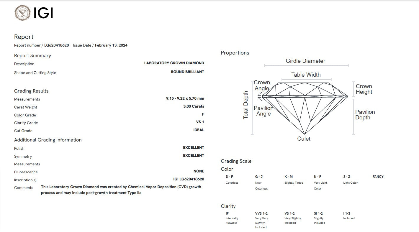 Este es el informe que detalla las características únicas de su diamante, emitido por IGI, uno de los laboratorios gemológicos más reconocidos y confiables del mundo.