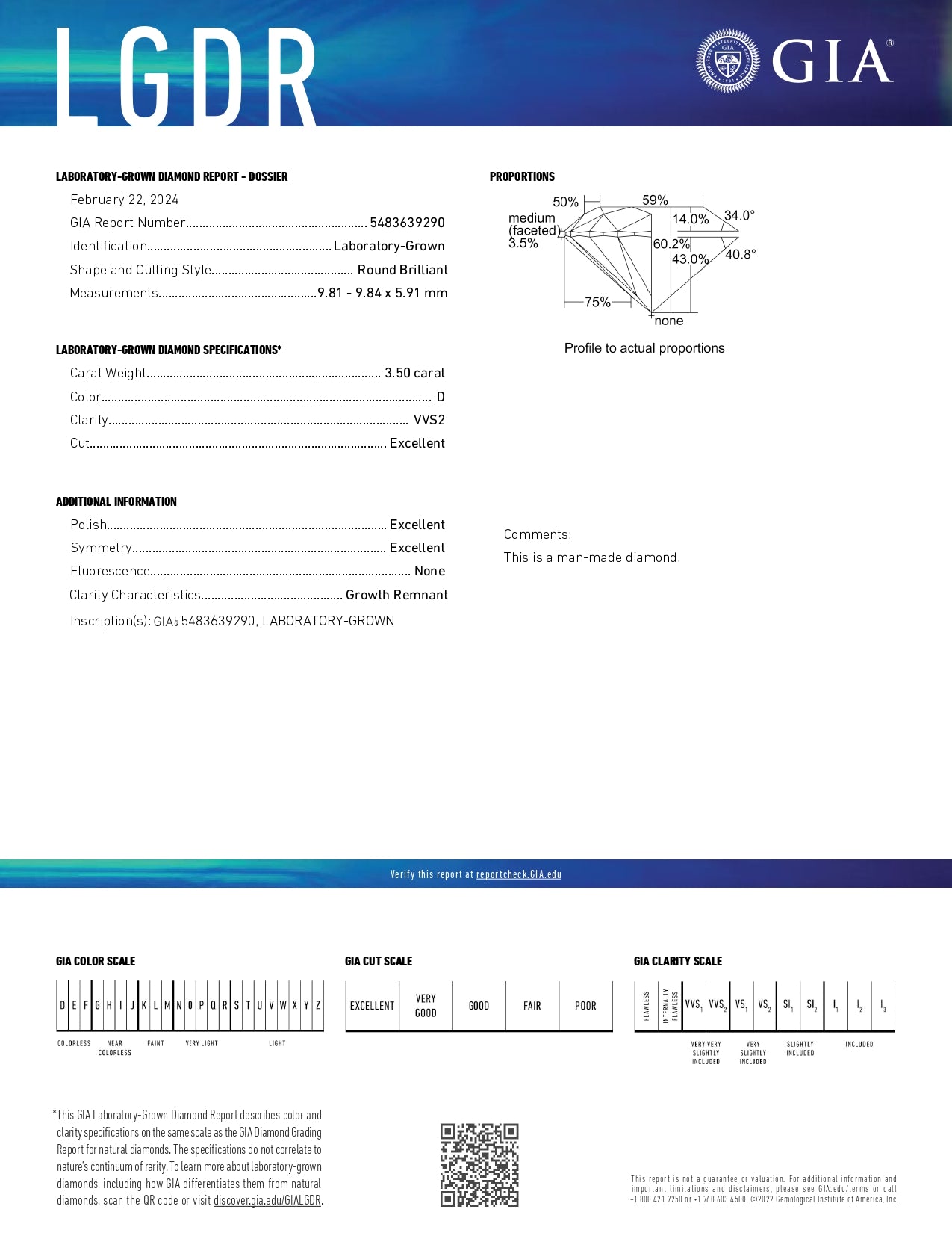 Diamante suelto cultivado en laboratorio de talla brillante redonda de 3,50 quilates, D VVS2, con certificación GIA