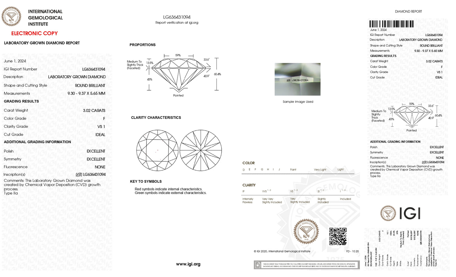 Este diamante cultivado en laboratorio de 3,02 quilates exhibe la codiciada talla brillante redonda, que proporciona un brillo y una intensidad excepcionales. Su color es F, lo que significa que es incoloro a simple vista, y VS1 en claridad, con inclusiones mínimas visibles solo con aumento.
