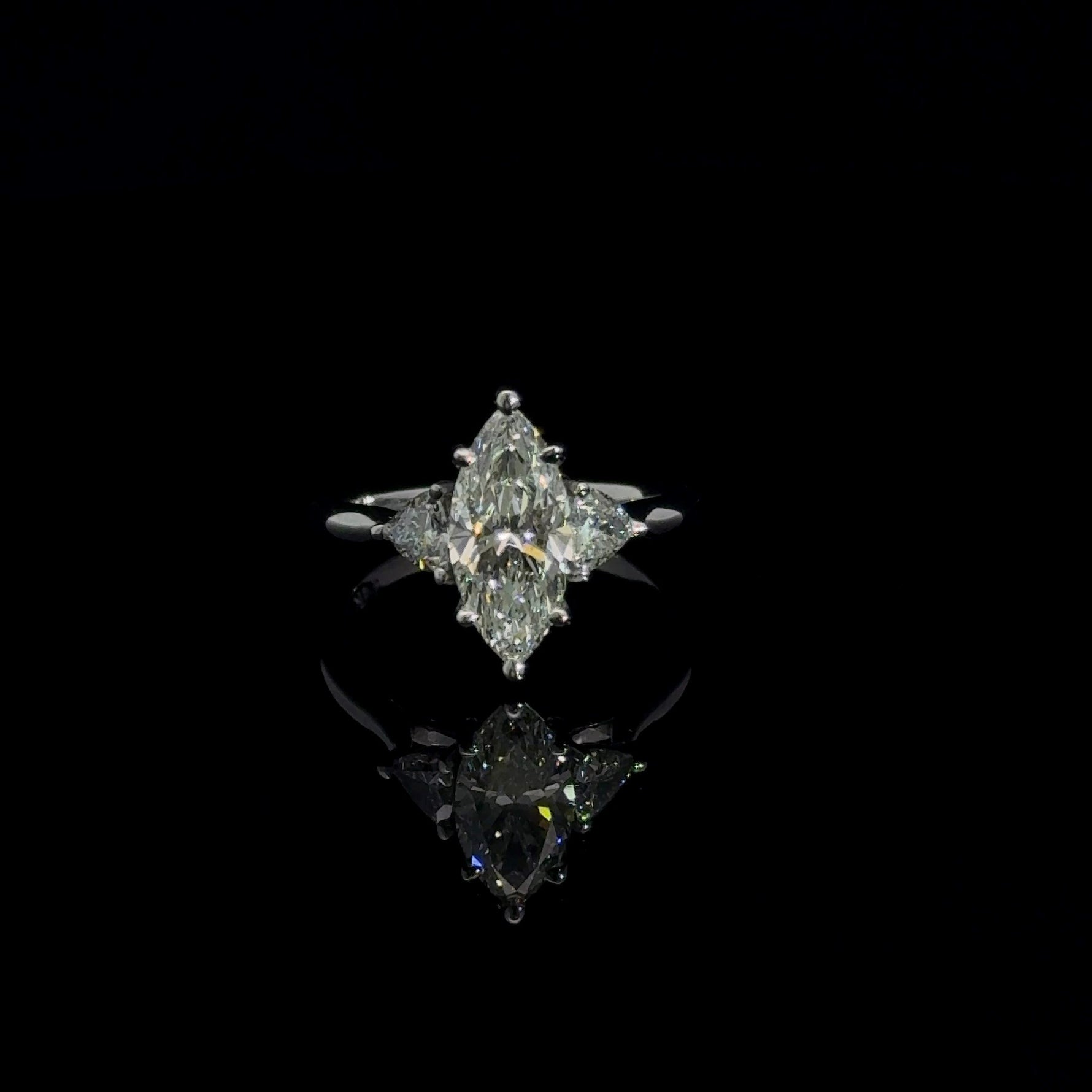 Elegante y distintivo, este anillo de compromiso de oro blanco de 14 quilates luce un impresionante diamante cultivado en laboratorio de 1,75 ct en forma de marquesa como piedra central. Con grado de color E y claridad VS1, el diamante con certificación IGI (certificado n.° 629437680) ofrece un brillo excepcional con su silueta alargada y cónica. Con un peso total de 2,18 quilates, este anillo es una elegante expresión de individualidad y belleza atemporal. ENG-00056