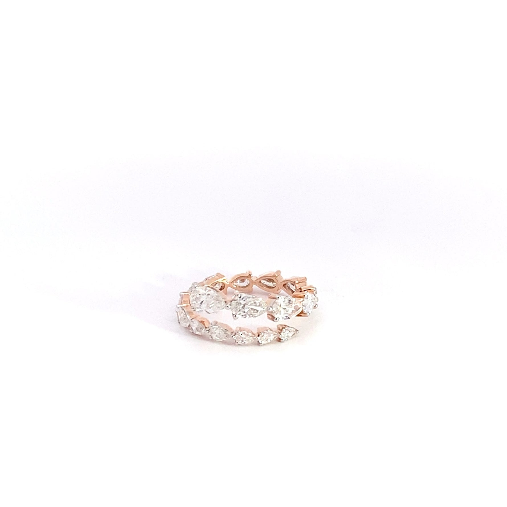 Elegante y llamativo, este anillo envolvente graduado aporta una elegancia escultural al dedo. Elaborado en cálido oro rosa de 14 quilates, el diseño envuelve delicadamente la mano, luciendo una serie de diamantes cultivados en laboratorio en forma de pera que aumentan gradualmente de tamaño. Con un peso total de 2,49 quilates, cada piedra es de color F y claridad VS1, lo que brinda un brillo suave y luminoso desde cualquier ángulo. Romántico y moderno a la vez, es una pieza destacada diseñada para una sofisticación sin esfuerzo. Talla del anillo: 7.