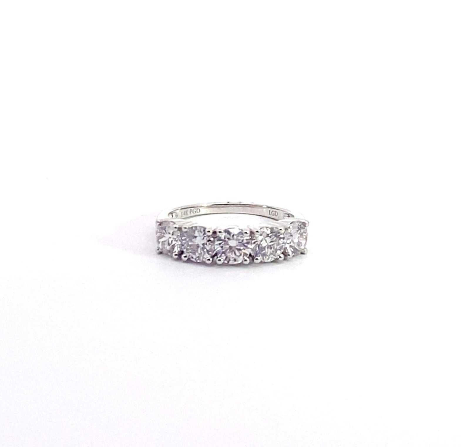 Elegante y atemporal, esta alianza de oro blanco de 14 quilates luce cinco diamantes redondos brillantes cultivados en laboratorio con un peso total de 2.00 quilates. Con grado de color F y claridad VS1, cada diamante se selecciona cuidadosamente por su excepcional brillo y simetría. Símbolo clásico del amor eterno, esta alianza es perfecta por sí sola o combinada con un anillo de compromiso para un brillo excepcional. WED-00006