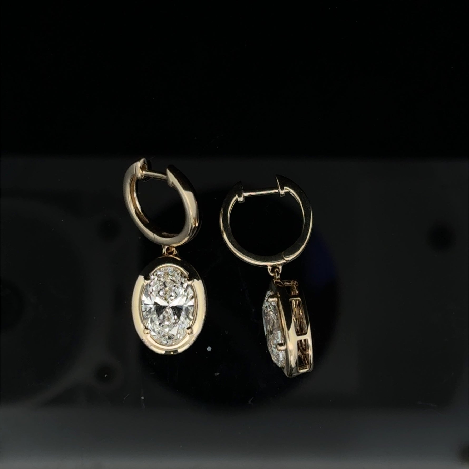Graceful and radiant, these drop earrings feature two striking oval cut lab grown diamonds—1.53 carats and 1.58 carats—set in warm 14K yellow gold. The diamonds are E in color and VS1 in clarity, offering exceptional brilliance in a refined, timeless design.