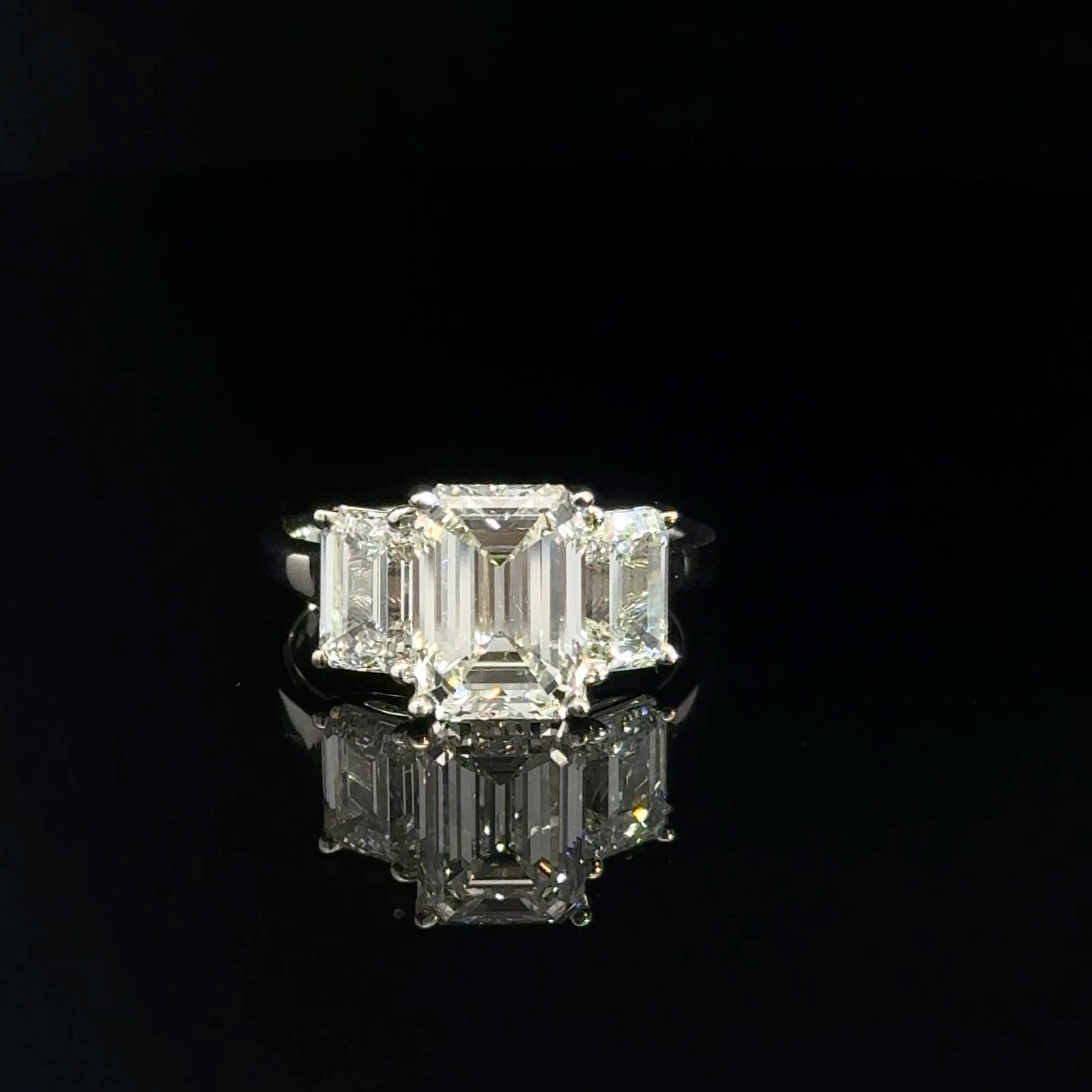 ANILLO DE COMPROMISO DE ORO BLANCO DE 14 QUILATES CON 3 DIAMANTES CRECIDOS EN LABORATORIO DE TALLA ESMERALDA DE 5,17 quilates. PIEDRA CENTRAL DE 3,14 quilates F/G EN COLOR VS1 EN CLARIDAD. IGI: 72J4650924. ENG-00086