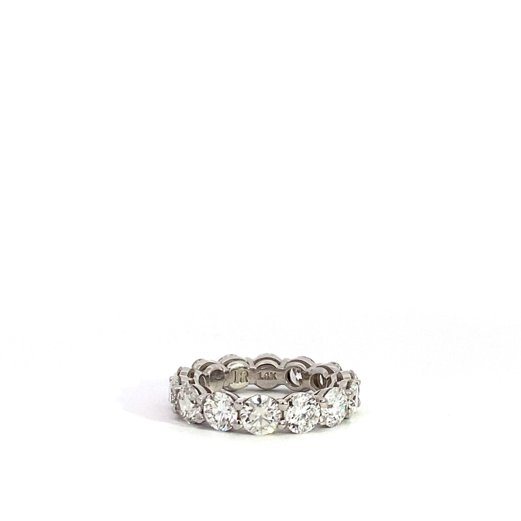 Clásica y radiante, esta alianza de eternidad de oro blanco de 14 quilates presenta una hilera continua de diamantes redondos brillantes cultivados en laboratorio con un total de 5,66 quilates. Cada diamante tiene una clasificación de color F y una claridad VS1, lo que le otorga un brillo y una simetría excepcionales desde cualquier ángulo. Ya sea que se use sola o en conjunto, esta pieza aporta belleza atemporal y una elegancia audaz a cualquier momento.